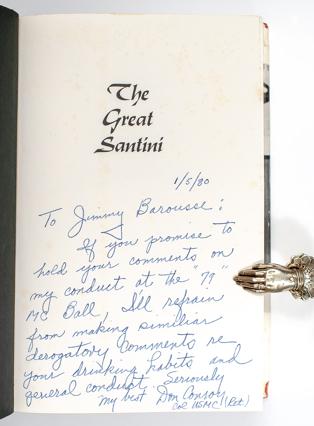 "If you promise to hold your comments on my conduct at the "79" MC Ball, I'll refrain from making similar derogatory comments re your drinking habits and general conduct": First Edition of Pat Conroy's Classic The Great Santini; Signed by both Pat and Donald Conroy