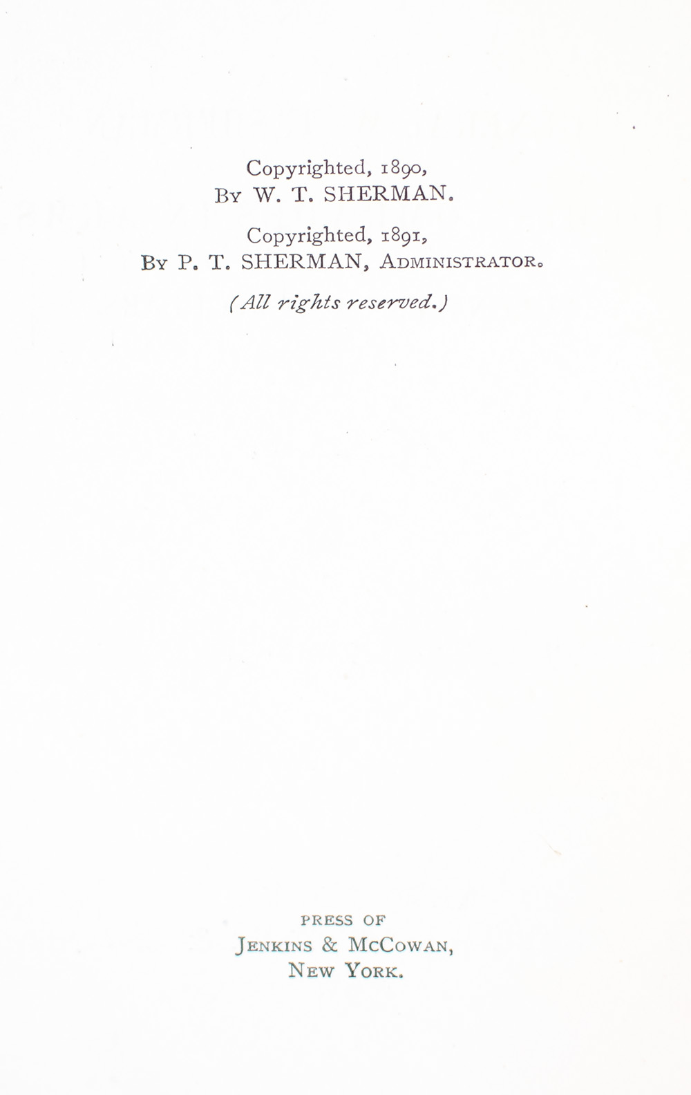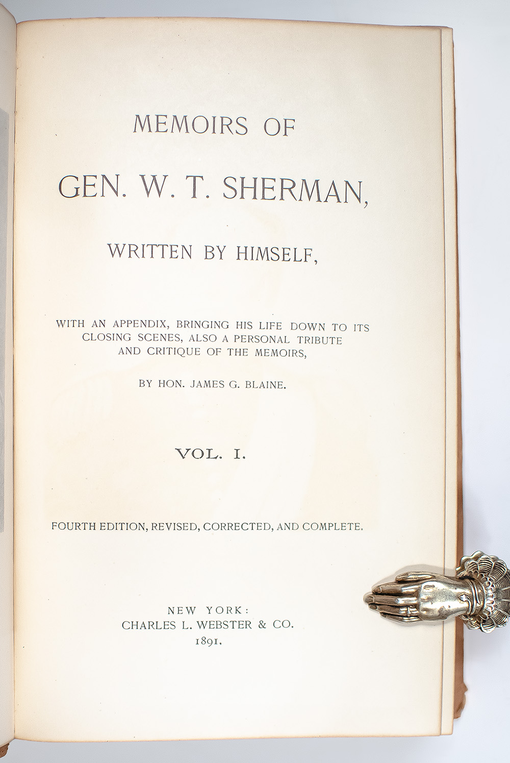 Rare Shoulder Strap set of five Civil War histories printed by Twain's publishing house in its short-lived but impressive decade of operation. Octavo, eight volumes bound in full tan sheep skin with gilt titles and ruling to the spine in five compartments within raised bands, red and black spine labels, all edges marbled, marbled endpapers, tissue-guarded frontispiece portraits to each volume, illustrated with steel engravings, maps, and woodcuts. The set features: a first edition of Personal Memoirs of U. S. Grant (Two volumes, 1885-1886); a first edition of McClellan's Own Story: The War for the Union, the Soldiers Who Fought It, and His Relations to It and to Them (1887); a first edition of Tenting on the Plains: or Gen. Custer in Kansas and Texas (1887); a first edition of Personal Memoirs of P. H. Sheridan (Two volumes, 1888); and a fourth edition of Memoirs of Gen. W. T. Sherman (Two volumes, 1891). In very good to good condition with rubbing to the extremities and light toning to the title pages of each volume, evidence of interior hinge repair and library stamps to the first and last leaves of the Sherman and Custer memoirs, a gift inscription to the first volume of Sheridan's memoirs, darkening to the top edge of both volumes of the Sheridan memoir, library checkout card and pocket to the rear pastedown of the Custer volume. An exceptionally rare set, especially in this condition.