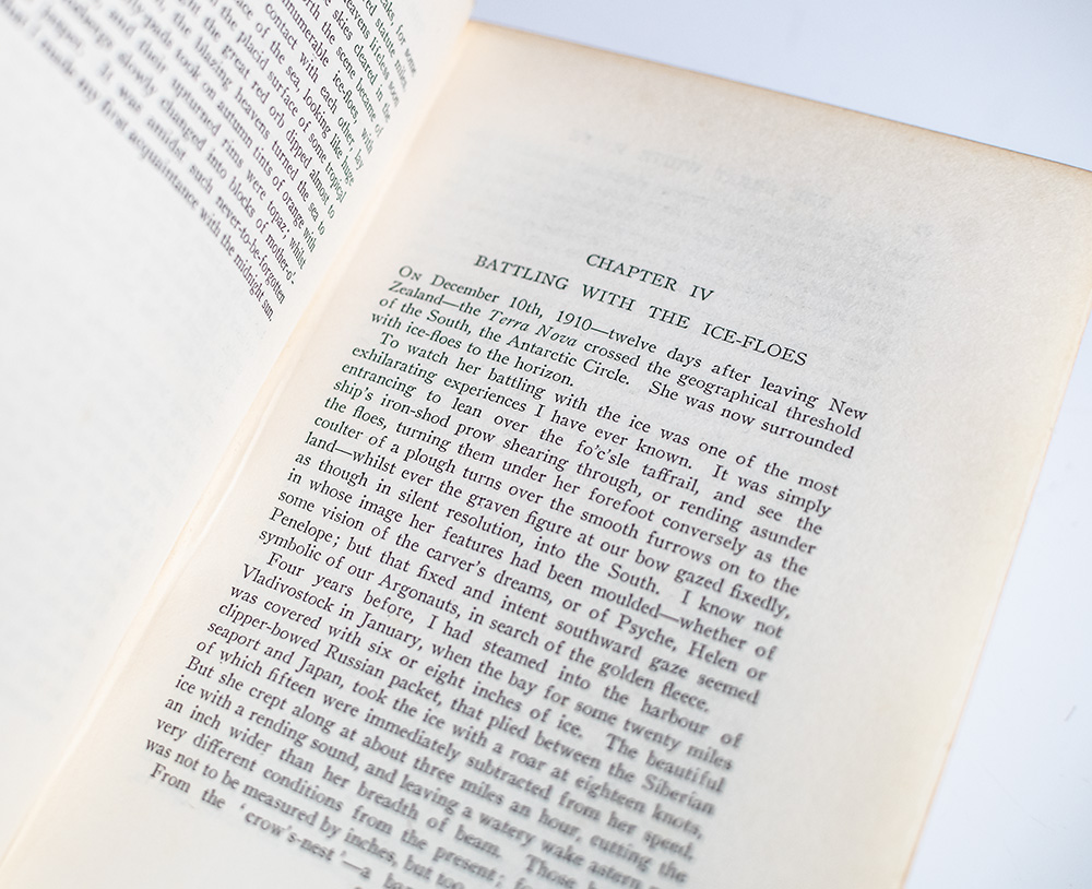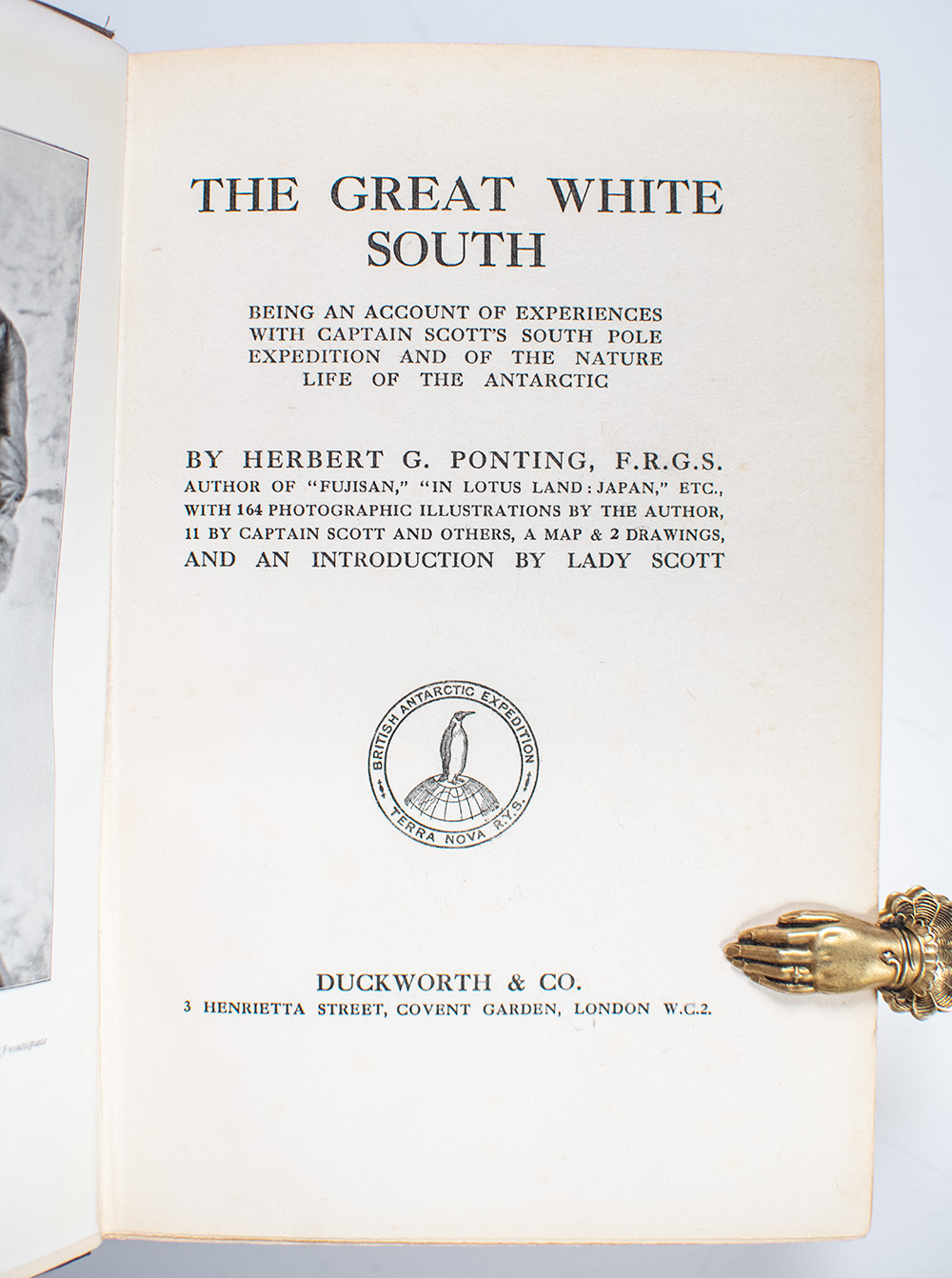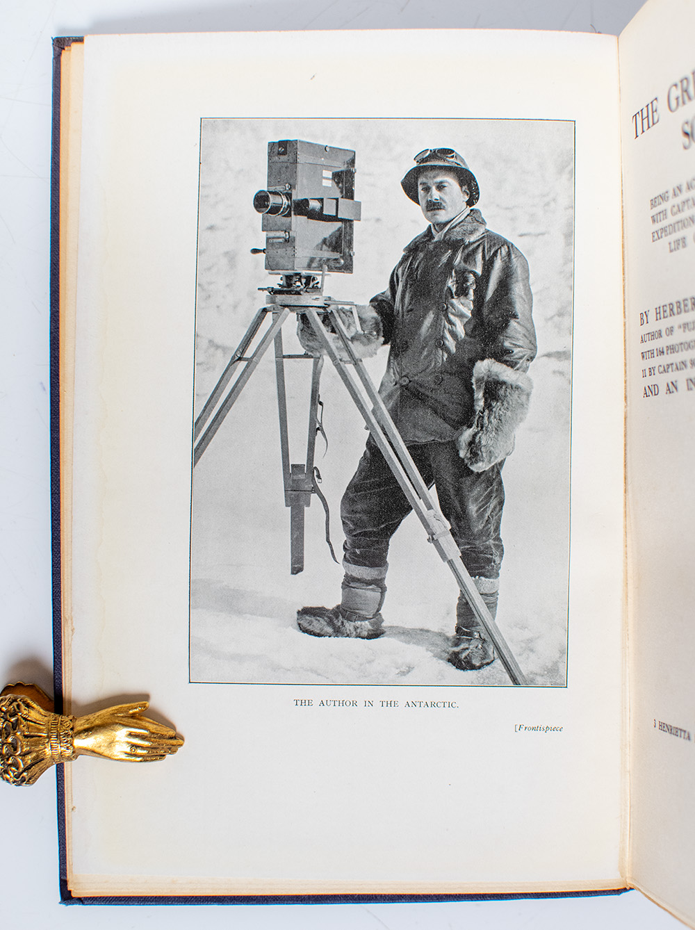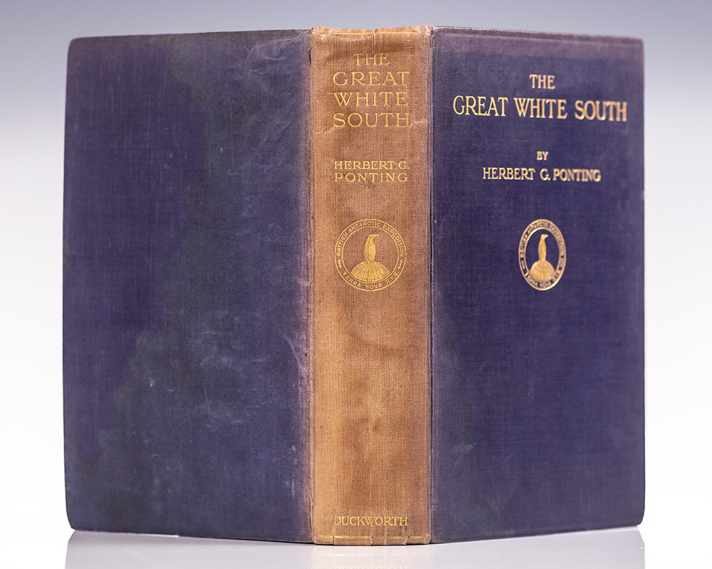 First edition of this first hand account of Captain Scott's ill-fated last expedition. Octavo, original publisher's blue cloth with gilt titles and British Antarctic Expedition vignette to the spine and front panel, frontispiece, with 164 photographic illustrations by the author, 11 by Captain Scott and others, a map, and 2 drawings. In good condition with sunning to the spine. Introduction by Lady Scott.