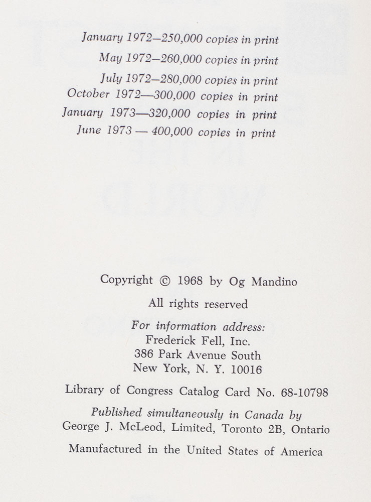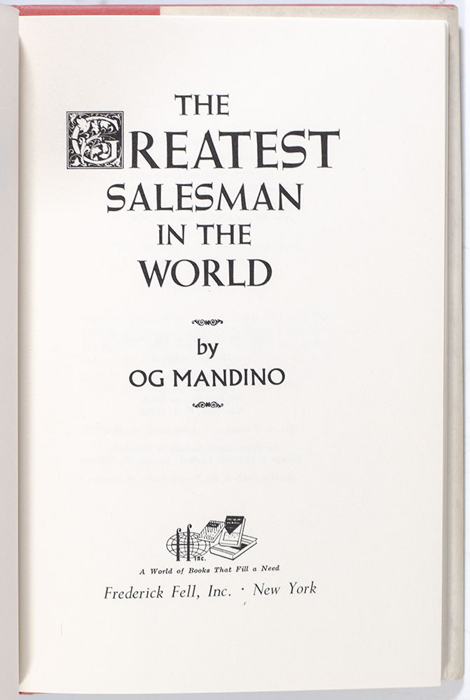 Early printing Mandino's classic work on salesmanship and success. Octavo, original cloth. Boldly signed by Og Mandino on the front free endpaper. Fine in a near fine price-clipped dust jacket.