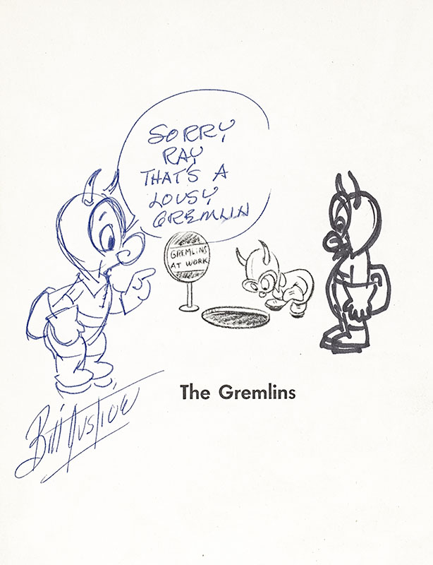 First Edition of Roald Dahl's The Gremlins; In the Rare Original Dust Jacket; Inscribed by Bill Justice With a Large Drawing