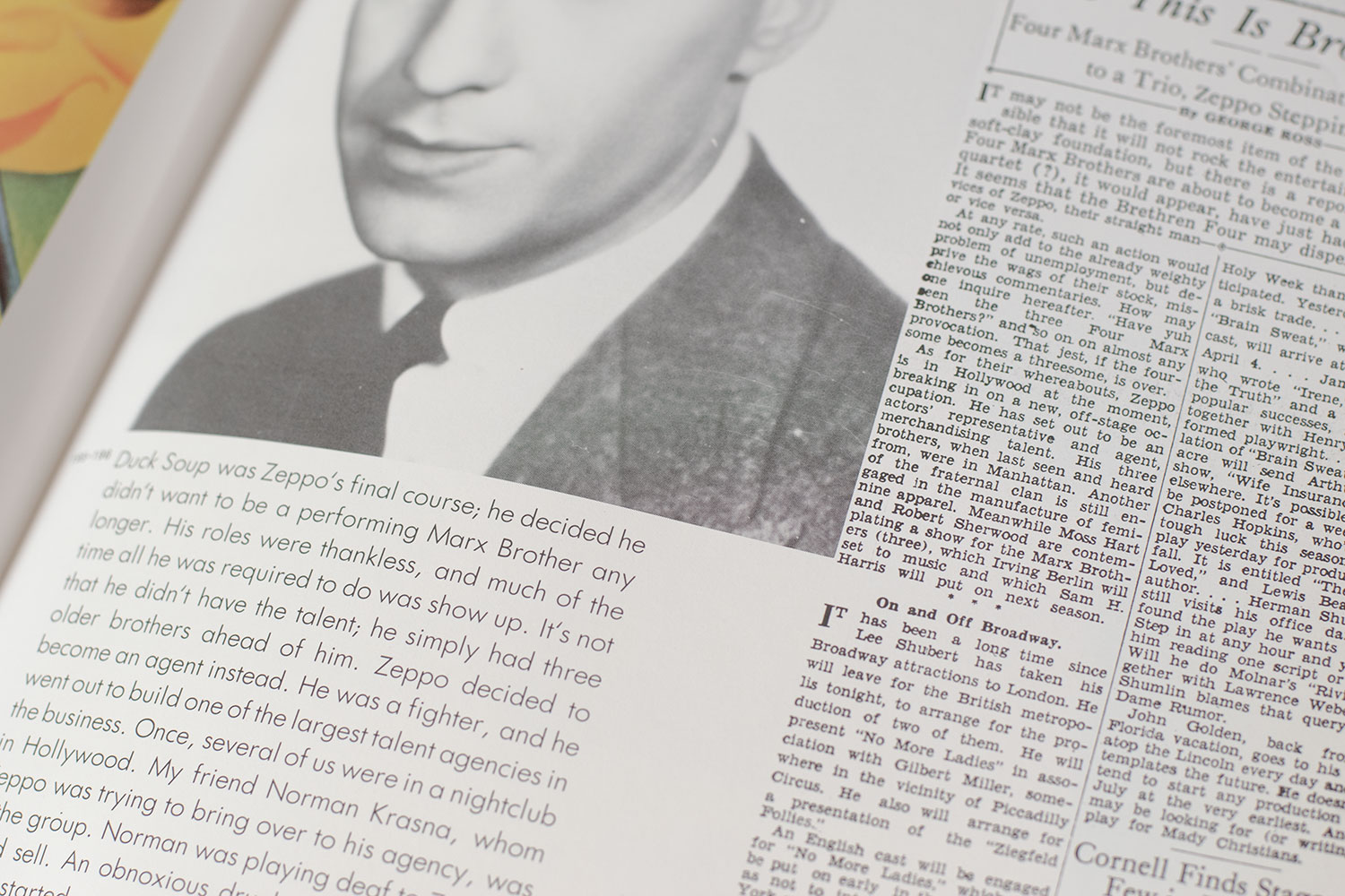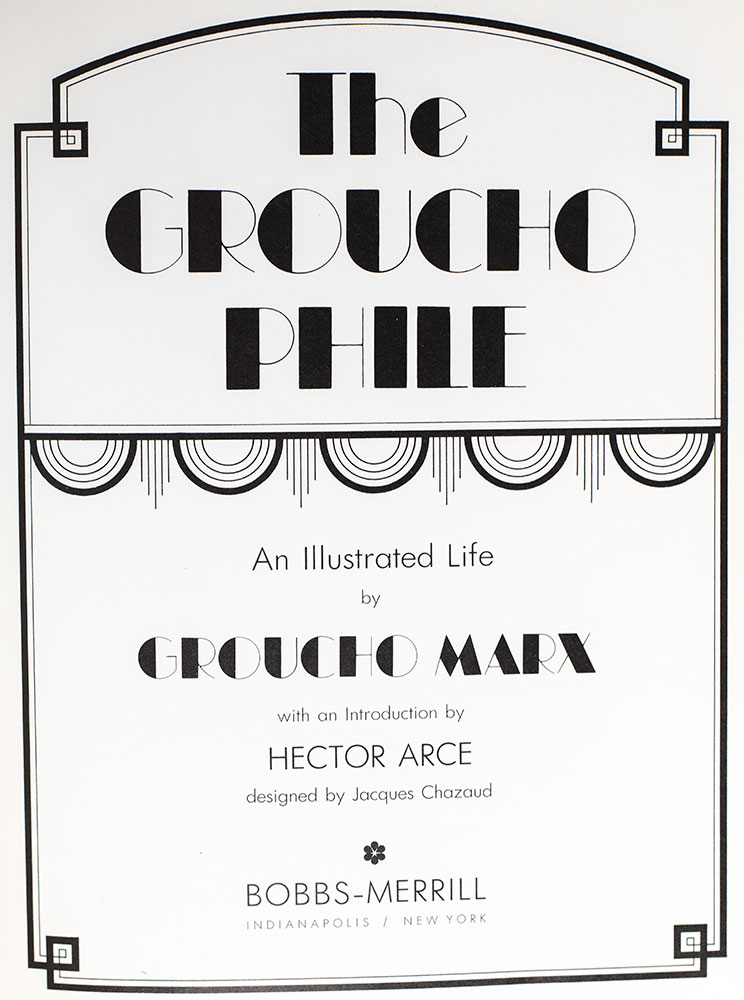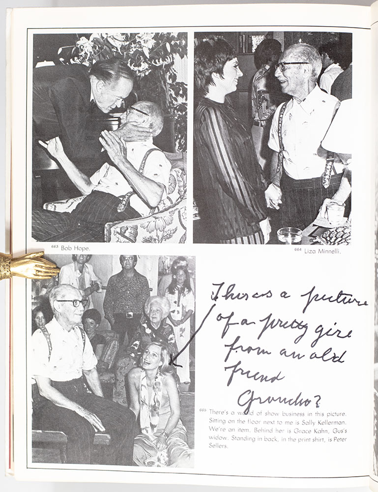 First edition of this work by the legendary comedian. Quarto, original boards. Association copy, inscribed twice by the author on the dedication page and again on page 364, "To Sally from Goucho?" On page 364 Groucho writes in his hand, “There’s a picture of a pretty girl from an old friend Groucho?” In the caption to the right Groucho states, "There's a world of show business in this picture. Sitting on the floor next to me is Sally Kellerman. We're an item." The recipient, Sally Kellerman was an actress and singer whose acting career spanned 60 years. Her role as Major Margaret "Hot Lips" Houlihan in Robert Altman's film M*A*S*H earned her an Oscar nomination for Best Actress in a Supporting Role. After M*A*S*H, she appeared in a number of the director's projects, namely the films Brewster McCloud (1970), Welcome to L.A. (1976) (produced by Altman, directed by his protégé, Alan Rudolph), The Player (1992), and Prêt-à-Porter (1994), and the short-lived anthology TV series Gun (1997). In addition to her work with Altman, Kellerman appeared in films such as Last of the Red Hot Lovers (1972), Back to School (1986), plus many television series such as The Twilight Zone (1963), The Outer Limits (1963 & 1965), Star Trek (1966), Bonanza (1966, 1970), The Minor Accomplishments of Jackie Woodman (2006), 90210 (2008), Chemistry (2011), and Maron (2013). She also voiced Miss Finch in Sesame Street Presents: Follow That Bird (1985), which went on to become one of her most significant voice roles. Introduction by Hector Arce. Designed by Jacques Chazaud. In near fine condition. An exceptional association.