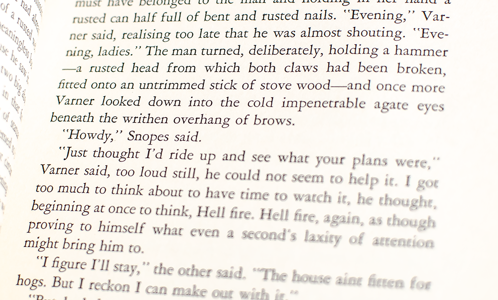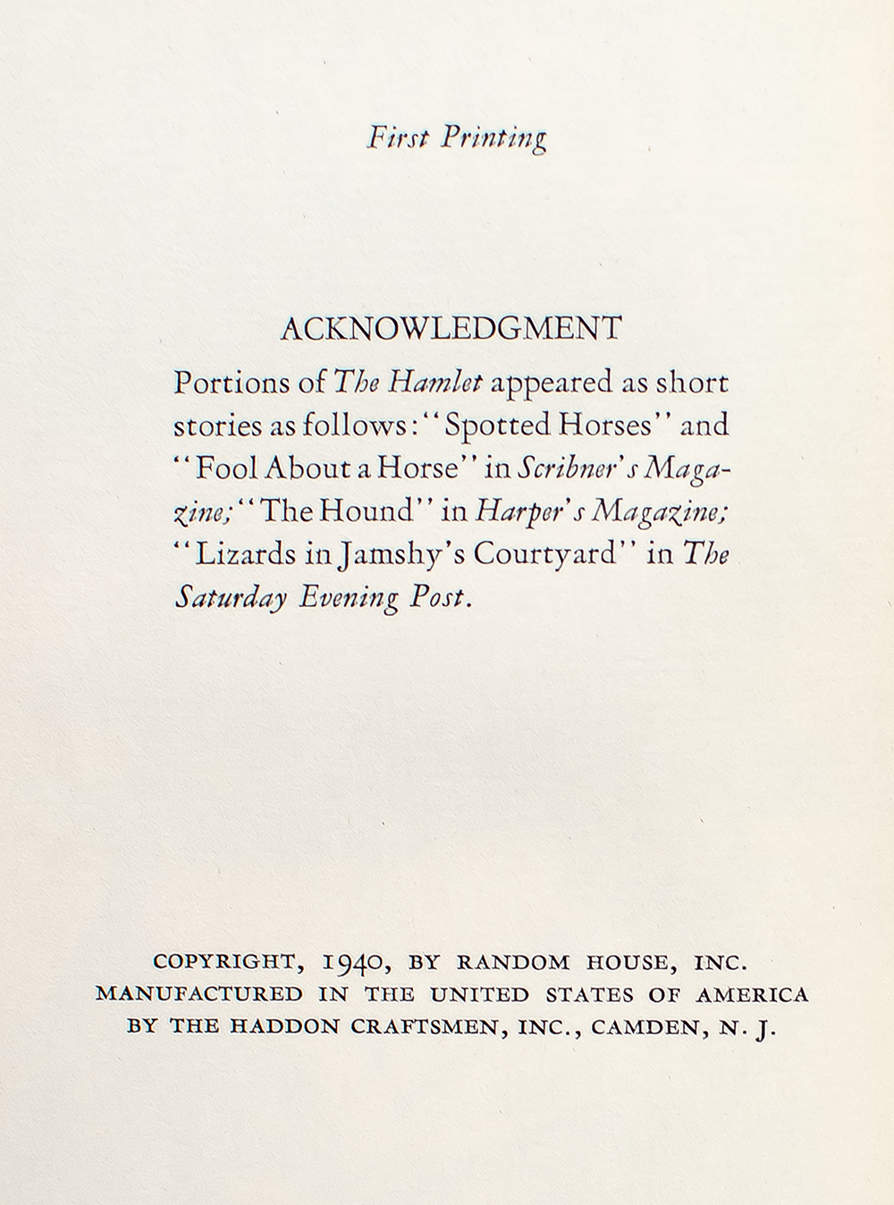 First edition, stated first printing of the first novel in Faulkner's acclaimed Snopes Trilogy. Octavo, original cloth. Fine in a very good first issue dust jacket with ads for ten other Random House titles on the rear panel. Jacket art by George Salter.