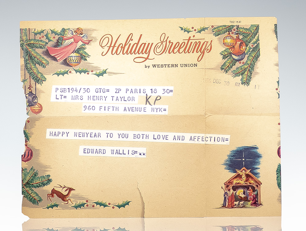 First edition. Octavo, original cloth. Association copy, inscribed by the author on the half-title page, "To Fay and Harry with my love and devoted friendship Wallis Windsor." With a Holiday Greetings from Western Union from Edward Wallis to the recipients laid in. The recipient, Henry Junior Taylor was an economist, author, radio broadcaster and former United States Ambassador to Switzerland He served as a foreign correspondent for the Scripps-Howard newspaper chain in the early years of World War II. After the war, Taylor hosted the General Motors-sponsored radio program Your Land and Mine, on which he was known for his conservative commentary. Taylor was a columnist for the United Feature Syndicate after serving as Ambassador. He authored several nonfiction books, including An American Speaks His Mind and It Must Be a Long War, and a novel, The Big Man. Very good in a good dust jacket, crease to the endpaper.