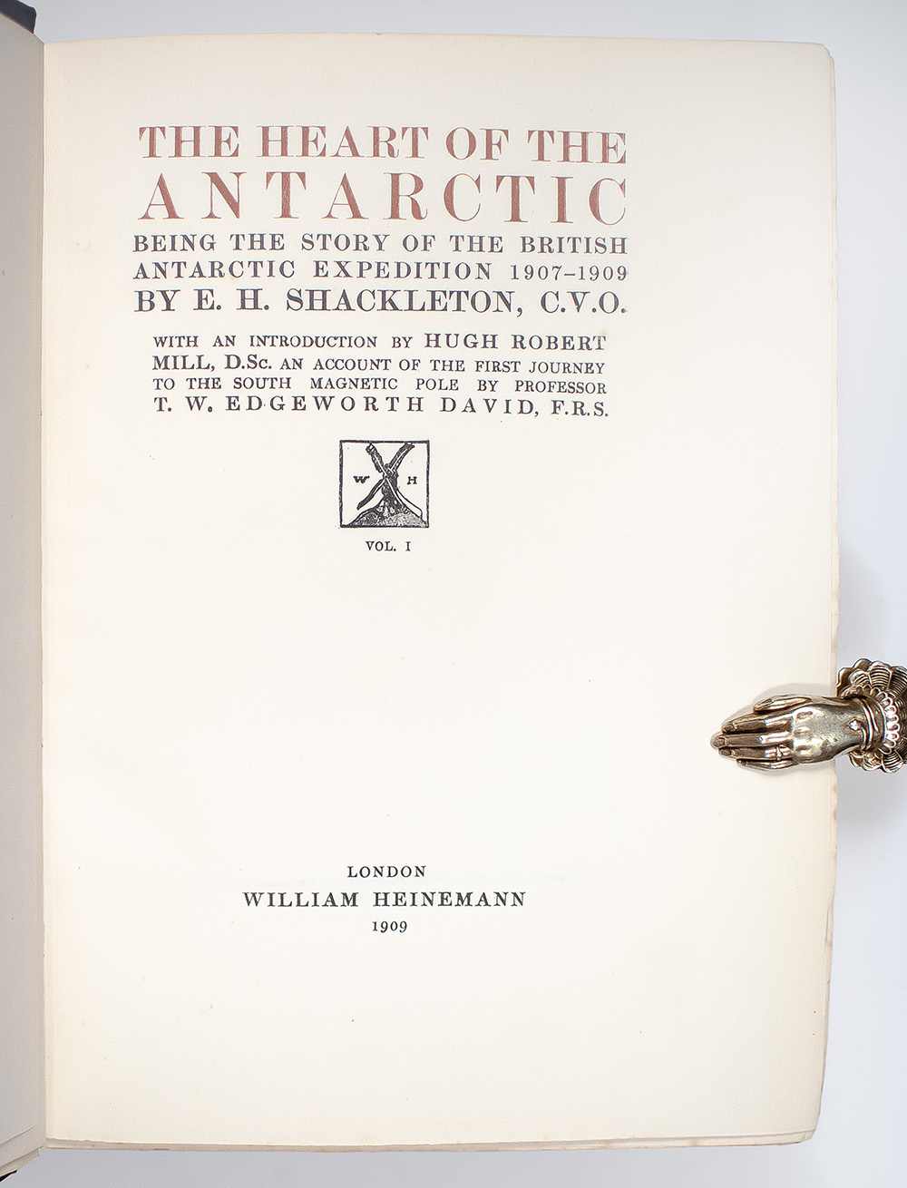 First trade edition of Shackleton's thrilling account of one of the earliest attempts to reach the South Pole, "the best book of polar travel which has ever been written" (Manchester Guardian). Large octavo, two volumes in the publisher's original blue cloth with gilt-lettered spines and large silver pictorial blocks to the front panels, top edge gilt, photogravure frontispiece to each volume, illustrated with 12 captioned tissue-guarded coloured plates and over 200 black and white plates, folding plate and 3 folding maps in rear pocket of Vol. II, numerous in-text illustrations and diagrams throughout, errata slip tipped into vol. II. With an introduction by Hugh Robert Mill, D.Sc. An account of the first journey to the south magnetic pole by professor T. W. Edgeworth David, F.R.S. Near fine in the rare original dust jackets with some professional restoration mainly to the spines. A very nice example of this desirable highspot in Antarctic literature.