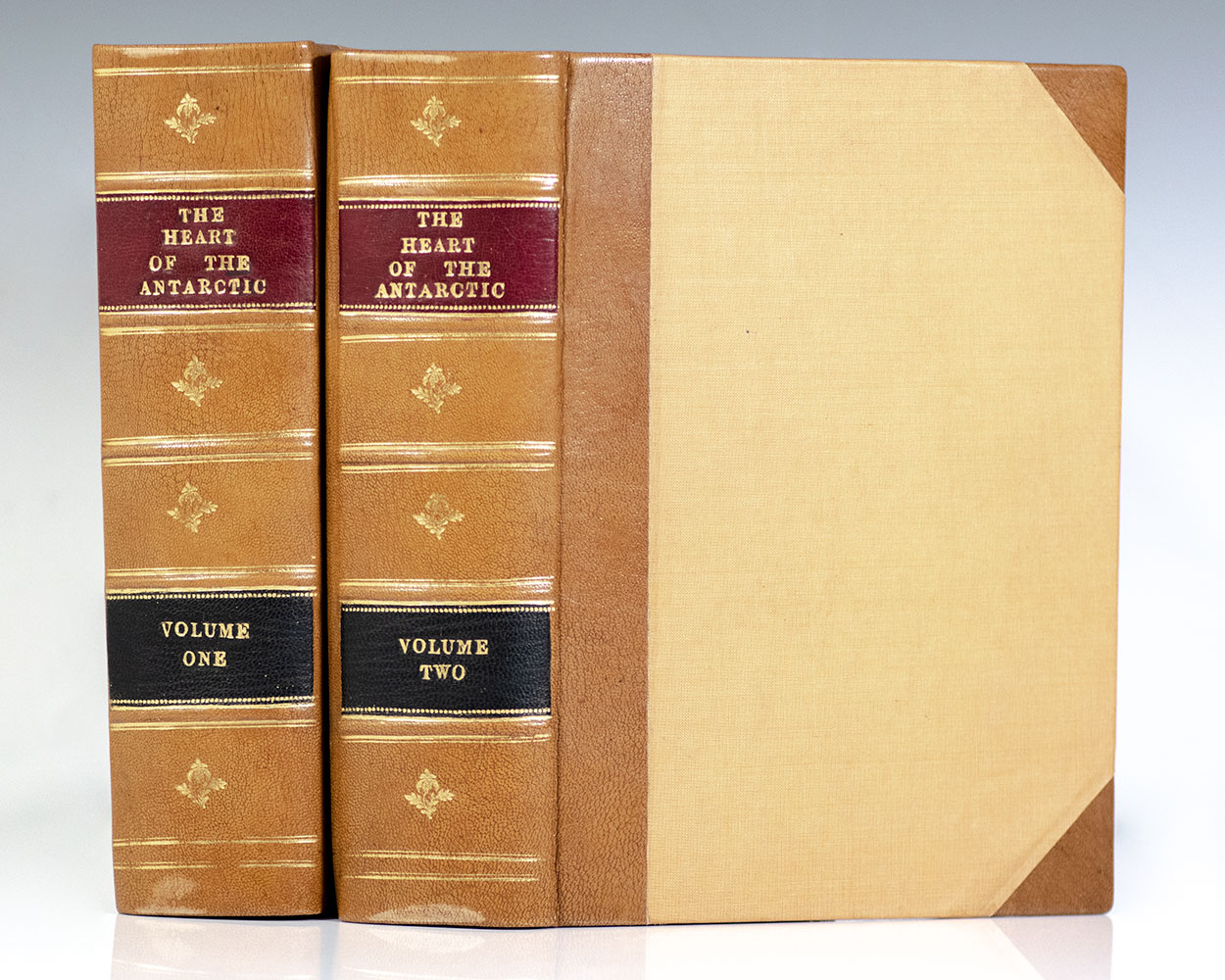 First editions of Shackleton’s fascinating account of the British Antarctic Expedition of 1907-1909. Large octavos, 2 volumes, bound in three quarters calf, morocco spine labels, photogravure frontispiece to each volume, 12 captioned tissue-guarded colored, and 255 black and white other plates in all, 3 maps, panorama in end-pocket of volume II, and numerous illustrations and diagrams throughout. In very good condition.