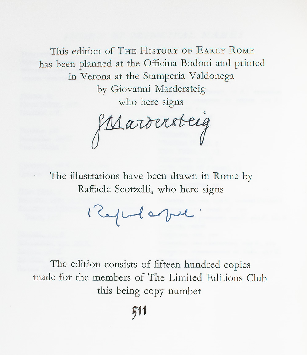 The Limited Editions Club signed limited edition of Livy’s classic Roman History. Octavo, bound in full modern morocco by Sangorski & Sutcliffe/Zaehnsdorf with gilt titles and tooling to the spine in six compartments within raised gilt bands, top edge gilt, gilt turn-ins and inner dentelles, marbled endpapers, frontispiece, with black and white illustrations and folding map. Boldly signed by illustrator Raffaele Scorzelli and printer Giovanni Mardersteig of Verona at the Officina Bodoni on the colophon page at the rear. One of 1,500 numbered copies, this is number 511. In fine condition. Translated by Aubrey de Sélincourt. Illustrated by Raffaele Scorzelli.