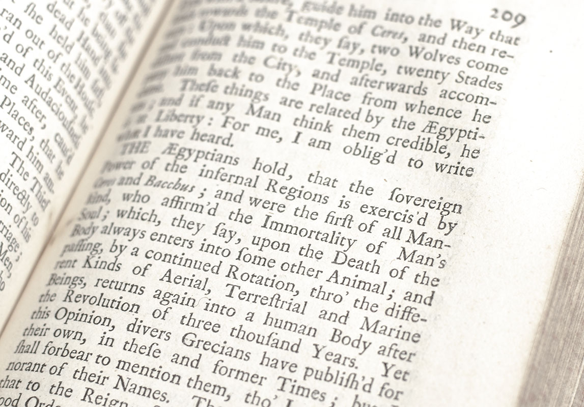 First complete edition in English of Littlebury's translation of the histories of Herodotus, also the first appearance in English since Thomas Marshe's 1584 incomplete translation of only the first two books. Octavo, two volumes. Bound in full contemporary calf with gilt titles and tooling to the spine in six compartments within raised bands, red morocco spine labels, stamped ruling, all edged speckled red, woodcut ornaments to the title pages and colophon of volume II, index. From the library of George Paterson of Castle Huntly with his armorial bookplates to the pastedowns. After amassing a large fortune with the East India Company, Paterson purchased the famed Scottish Castle Huntly in 1770. In very good condition. Rare and with noted provenance.