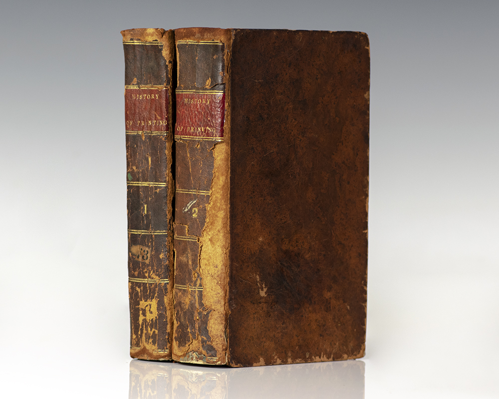 First edition of this work by the famed printer. Octavo, bound in contemporary sheep, morocco spine labels, illustrated with five engraved plates (four folding). Gift inscription of Thomas's grandson, Benjamin Franklin Thomas, on each of the front free endpapers, as well as his signature on title page in first volume. Benjamin Franklin Thomas was a member of the United States House of Representatives from Massachusetts and an associate justice of the Massachusetts Supreme Judicial Court. In good condition. Housed in a custom half morocco chemise and clamshell box. Grolier American 29; Howes T 168; Sabin 95495; Streeter 7:4176.