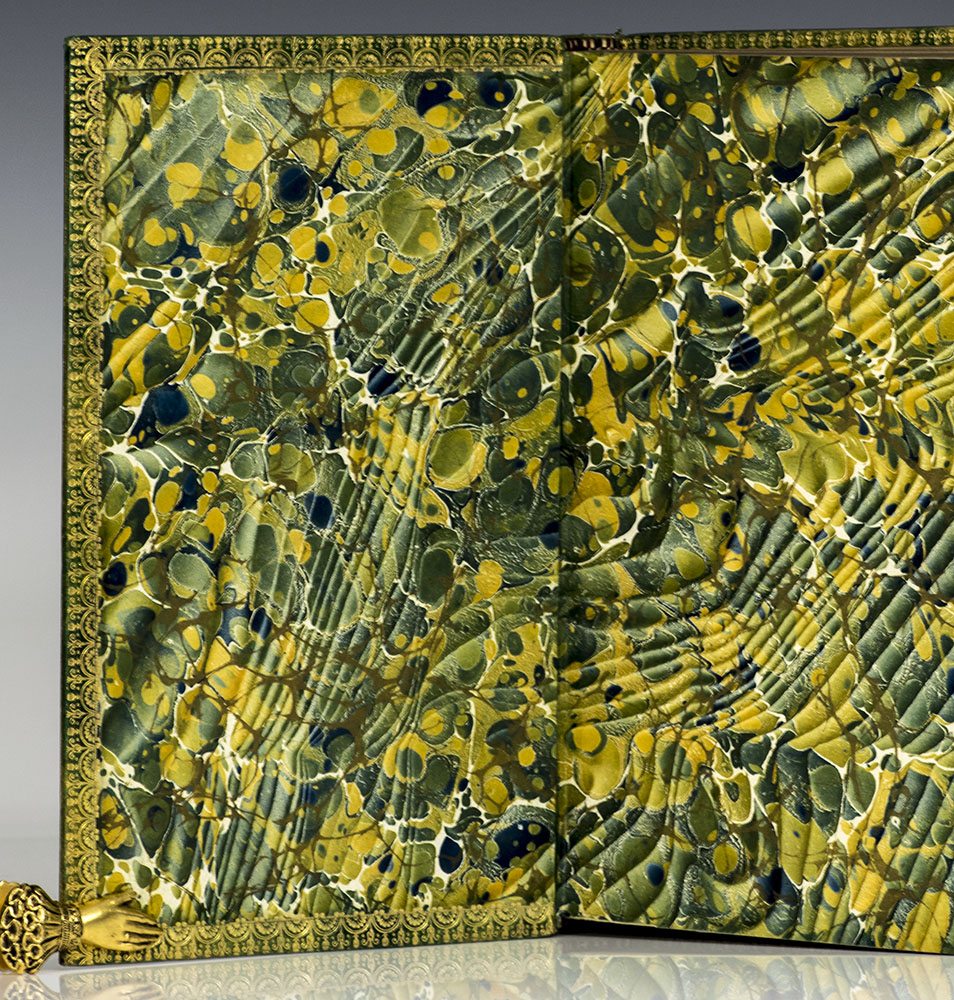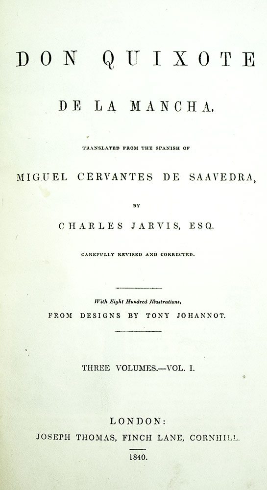 Finely bound example of Cervantes' masterpiece. Octavo, 3 volumes bound in full morocco, gilt titles and tooling to the spine, gilt tooling to the front and rear panels, gilt turn-ins, top edge gilt, marbled endpapers. With eight illustrations from design by Tony Johannot. Translated from the Spanish by Charles Jarvis. In fine condition. An exceptional example.