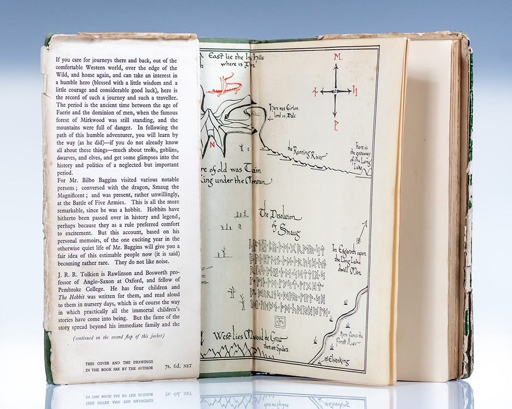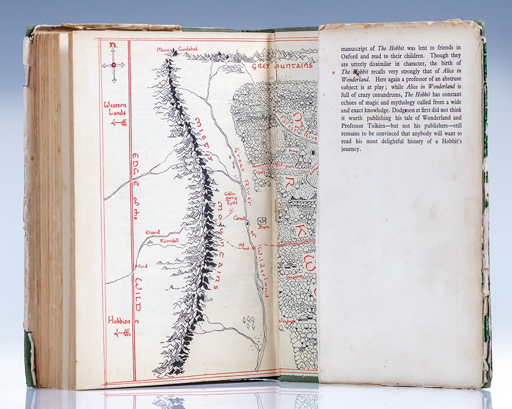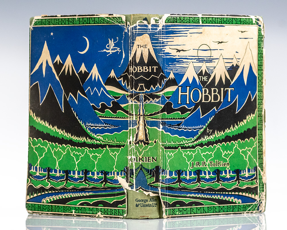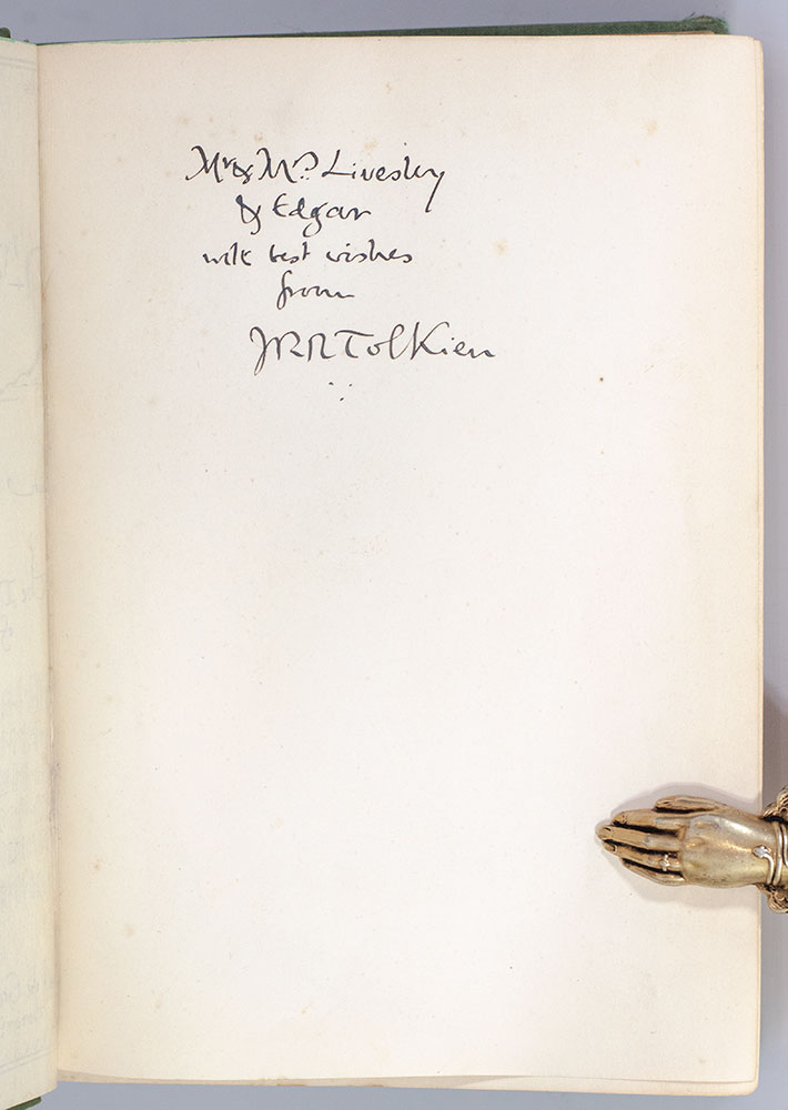 First edition, first issue of Tolkien's classic tale, "among the very highest achievements of children’s authors during the 20th century” (Carpenter & Pritchard, 530), one of only a handful of presentation copies reserved for Tolkien to give to family members, colleagues and close friends. Octavo, original cloth, cartographic endpapers, frontispiece and 9 full-page uncolored illustrations after drawings by Tolkien. Presentation copy, inscribed by Tolkien on the flyleaf, "Mr. & Mrs. Livesley & Edgar with best wishes from J.R.R. Tolkien." The recipients, the Livesleys and their son Edgar, ran the Kennaway House, a Regency town house in the village of Sidmouth, East Devon which Tolkien used as a summer holiday home and the surrounds of which inspired the landscapes, flora, and fauna of The Shire", the region of Middle-earth inhabited hobbits first introduced in The Hobbit. Situated on the rocky coast of the rustic Devon countryside, the village of Sidmouth has featured in a number of famed literary works, as "Stymouth" in Beatrix Potter's children's story The Tale of Little Pig Robinson (1930), "Idmouth" in Thomas Hardy's Wessex, "Baymouth" in William Makepeace Thackeray's Pendennis, and "Spudmouth" in The Merry Adventures of Robin Hood by Howard Pyle. English poet Elizabeth Barrett lived in the town from 1832 until 1835. In the final stages of The Hobbit's revisions, Tolkien notably penned a list of special recipients he wished to present copies of the first printing of the book to upon publication, including C.S. Lewis, R.W. Chambers, R.W. Chambers, Simone d’Ardenne, George S. Gordon, Elaine Griffiths, his aunts Mabel Mitton and Florence Hadley, and the Livesleys who hosted him at the Kennaway House. Published on September 21, 1937, the first printing of the Hobbit constituted only 1500 copies and completely sold out by December 15th. Near fine in a very good first issue supplied dust jacket with chips to the extremities. Housed in a custom full morocco clamshell box. An exceptional association of the most highly coveted work in literature.