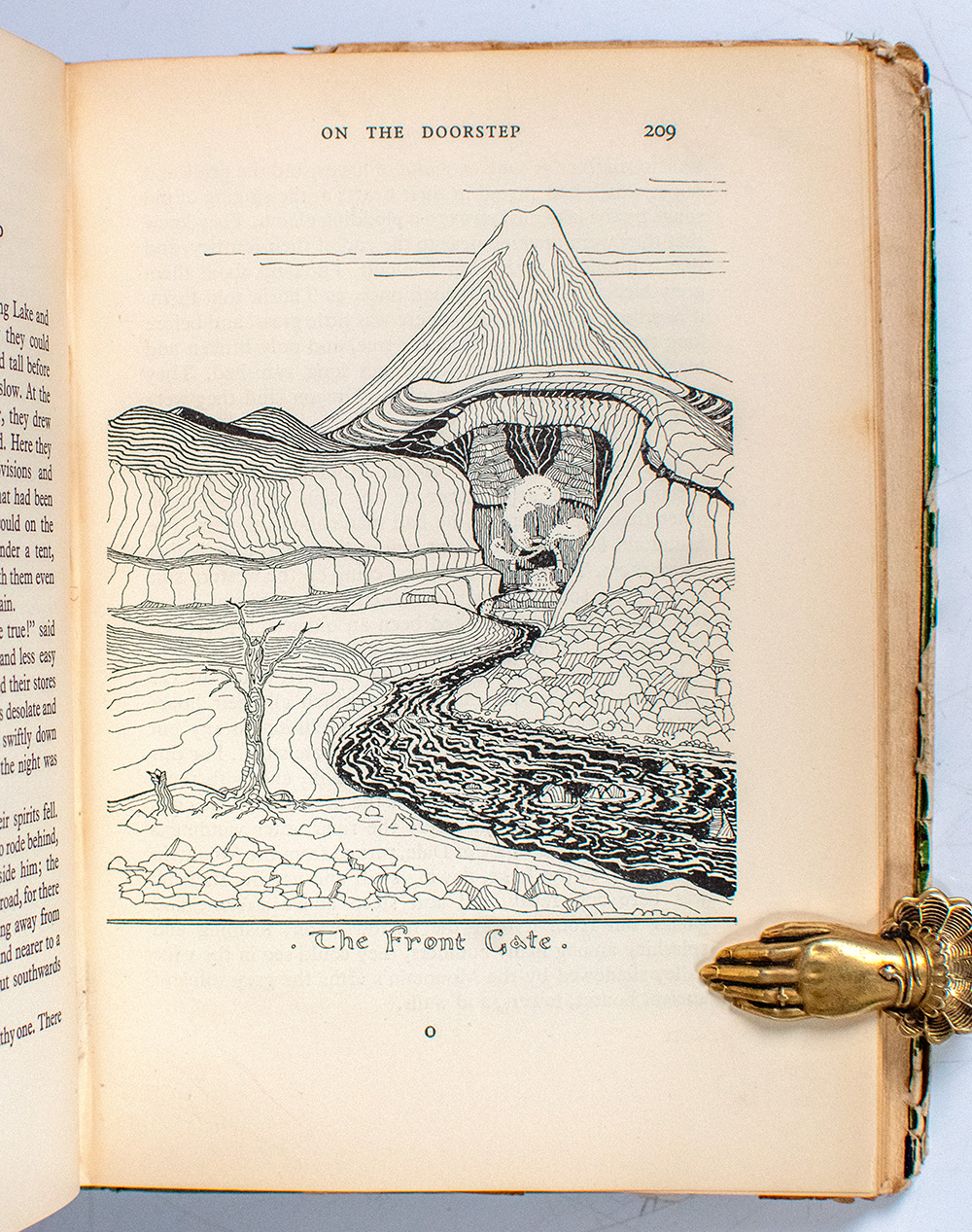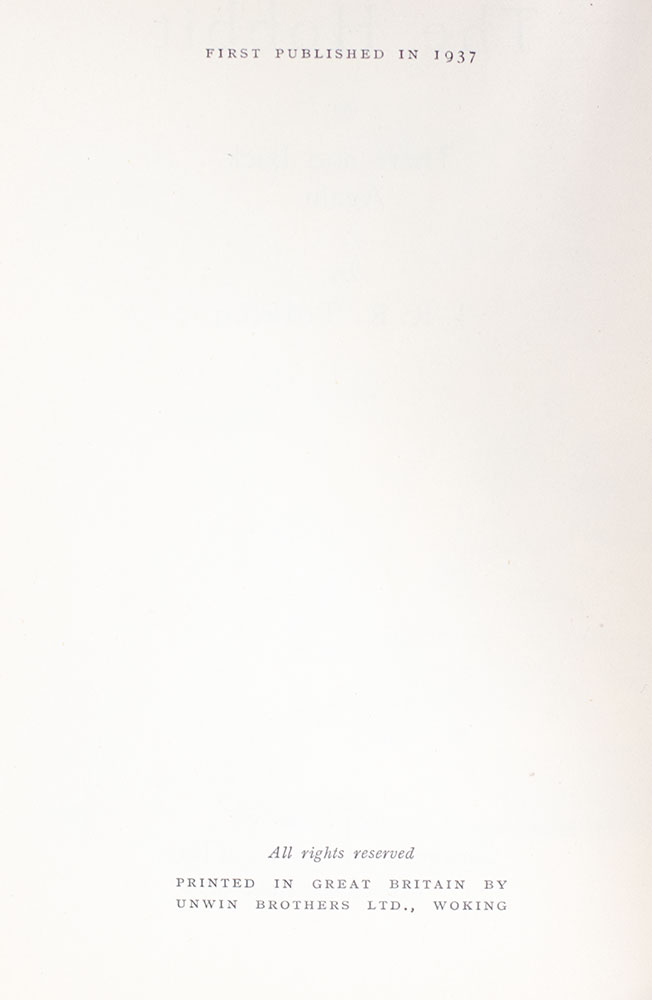 "In enchanted Middle-earth, a small, comfort-loving Hobbit is awakened from his slumbers by a visitor who tells of lost treasure. Before Bilbo Baggins returns home again, he journeys past wizards and elves, talkative trees and treasure-guarding dragons, all swirling in cosmic battle between good and evil. J.R.R. Tolkien's fully realized fantasy world won over generations of children, and dazzled adults with its deft interweaving of medieval legend and made-up languages, maps, and creatures. Tolkien legitimized the modern fantasy genre, and provided the 1960's counterculture with antiwar, back-to-Eden icons" (NYPL Books of the Century 199). “Professor Tolkien’s epic of Middle Earth… [is] one of [the twentieth] century’s lasting contributions to that borderland of literature between youth and age. There are few such books—Gulliver’s Travels, The Pilgrim’s Progress, Robinson Crusoe, Don Quixote, Alice in Wonderland, The Wind in the Willows—what else?… [They are] destined to become this century’s contribution to that select list of books which continue through the ages to be read by children and adults with almost equal pleasure” (Eyre, 67, 134-5). "All historians of children’s literature… agree in placing [The Hobbit] among the very highest achievements of children’s authors during the 20th century” (Carpenter & Prichard, 254, 530). Published on September 21, 1937 in a first printing of only 1500 copies, The Hobbit had completely sold out by December 15. “It may have been a surprise to its publishers that a work as sui generis as The Hobbit should have been a popular success, but once it was a success there can have been no surprise in the clamor for a sequel. Tolkien had opened up a new imaginative continent, and the cry now was to see more of it” (Shippey, 49).