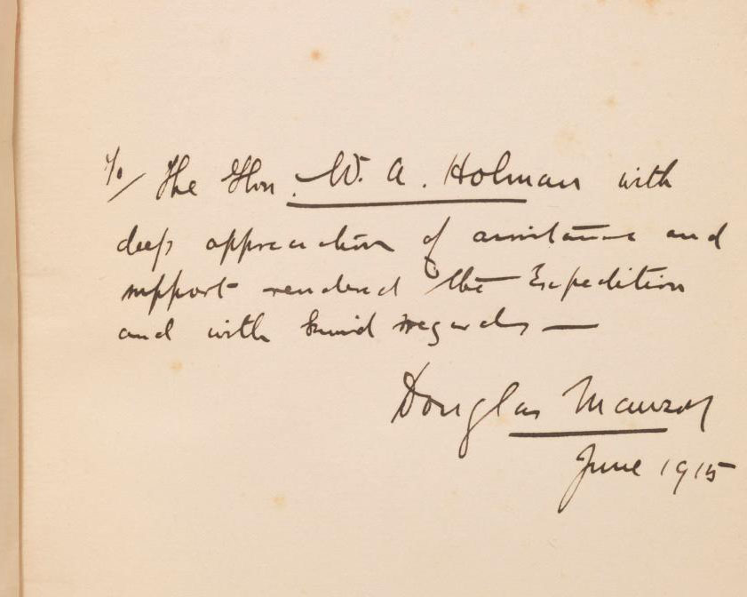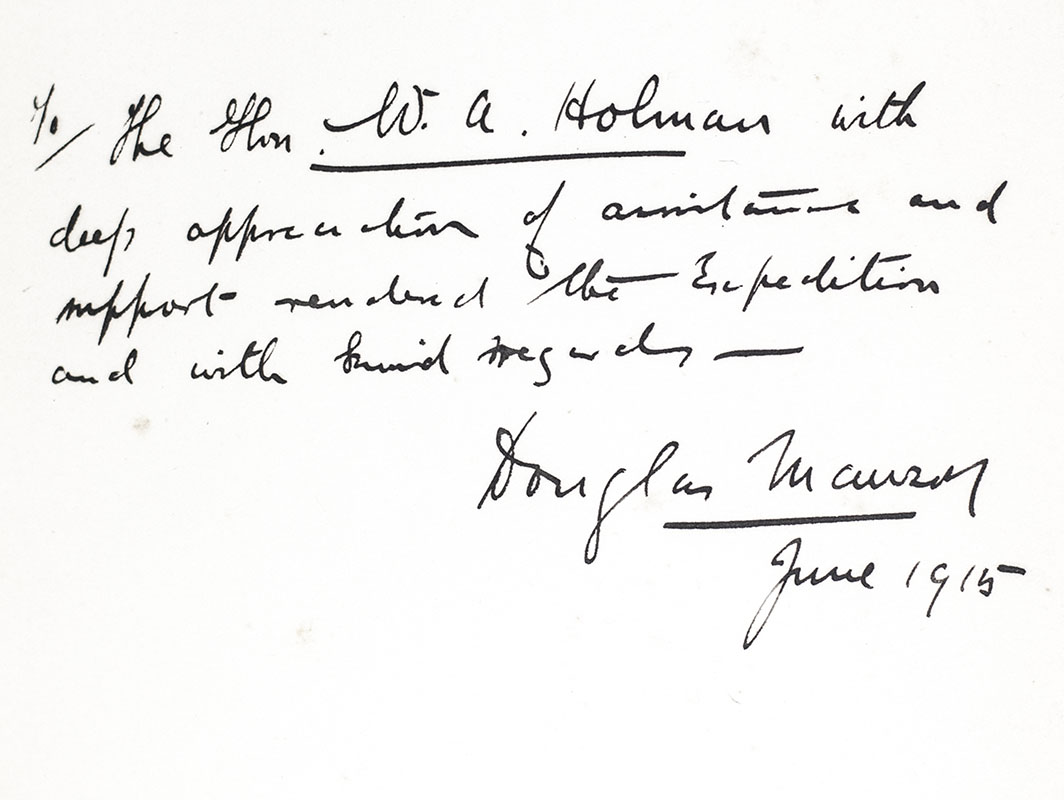 First edition of this classic account of Antarctic exploration, an exceptional association copy inscribed by the author in both volumes in the year of publication to a fellow Australian, the Premier of New South Wales. Quarto, two volumes, original dark blue cloth with gilt titles to the spine, gilt vignette to the front panels, profusely illustrated with 18 color plates, hundreds of black-and-white plates, numerous in-text illustrations and three color folding maps. Association copy, inscribed by the author on the second free endpaper of each volume in the year of publication to the Premier of New South Wales, William Arthur Holman. In Volume I, "To the Hon. W.A. Holman with deep appreciation of assistance and support rendered the Expedition and with kind regards Douglas Mawson, June 1915," and in Volume II, "To W.A. Holman from the author—Douglas Mawson, June 1915." The recipient, William A. Holman, born in London, settled in Australia in 1888, where he became a dynamic leader of the New South Wales Labor Party. Famed as a "brilliant and popular politician," in 1913 he was named the 19th Premiere of New South Wales (Australian Dictionary of Biography). Holman was highly supportive of the Antarctic expedition. When Mawson struggled to finance publication of the groundbreaking Scientific Reports crucial to its documentation, Holman authorized the New South Wales government to take over the printing. Given that Mawson, unlike Scott and Shackleton, was a scientist, publication of Home of the Blizzard was not enough to "justify the cost of the expedition … [and] the responsibility for hard scientific results weighed more heavily on him" (Ayres, Mawson, 113-14). Mawson honored Holman's importance to the expedition by naming Holman's Dome, discovered by the AAE, after him. This copy also notably from the library of prominent Australian author, historian and bibliophile Dr. George Mackaness, with his bookplate in each volume. By the 1960s the library of Mackaness, "a major figure in Sydney literary circles… [held] probably the largest private collection of Australiana… He made notable contributions in three fields—as a teacher of English, as a historian who made available quantities of documentary material, and as a bibliophile who made the collecting of Australiana popular" (Australian Dictionary of Biography). In near fine condition. An exceptional association copy.