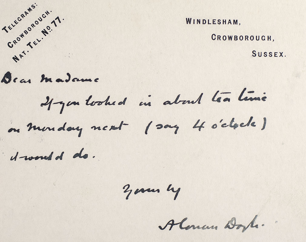 First edition, first issue of the third Sherlock Holmes novel, widely considered the best of the series. Octavo, original black and gilt stamped pictorial red cloth. Illustrated by Sidney Paget. In excellent condition with some rubbing and wear. Accompanied by an original autograph letter signed on Arthur Conan Doyle's letterhead which reads, "Dear Madame, if you booked in about ten time on Monday next (say 4 o'clock) I would do. Yours trly Arthur Doyle." The note is in fine condition. A highly desirable paring.