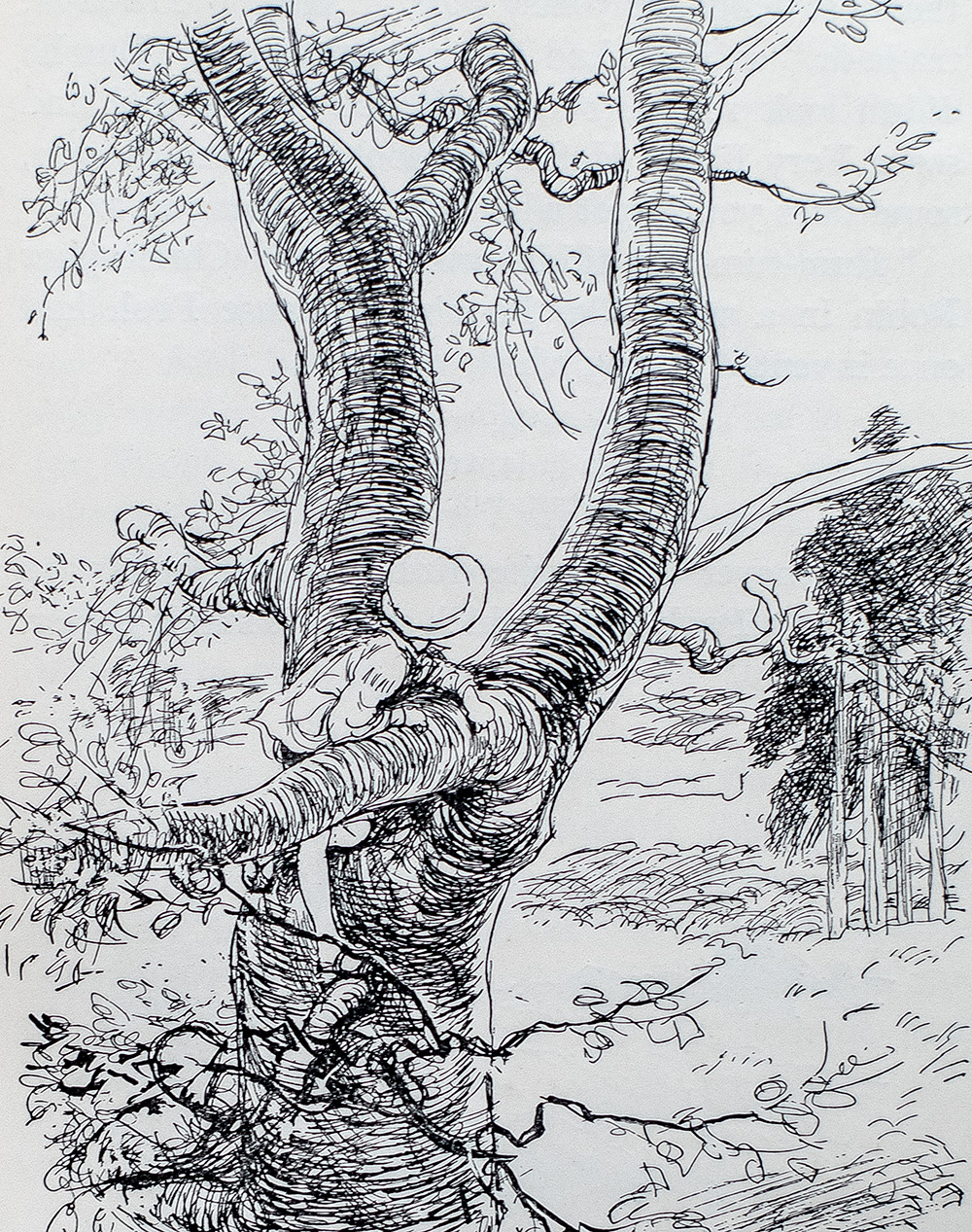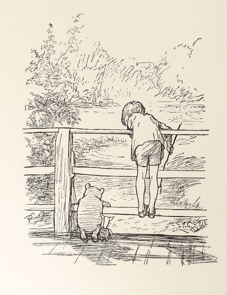 “Although Alan Alexander Milne wrote novels, short stories, poetry and many plays for adults, in addition to his work as assistant editor for Punch from 1906 to 1914, it is his writings for children that have captured the hearts of millions of people worldwide and granted Milne everlasting fame” (Silvey, 461). “On a rain-blighted holiday in Wales, [Milne] escaped from the crowd of fellow guests to the summerhouse, and for 11 days wrote a set of children’s verses, one each day… ‘There on the other side of the lawn was a child with whom I had lived for three years [his son, Christopher Robin]… and here within me were unforgettable memories of my own childhood.’ He added more verses when he got home, enough for a book, and allowed some to be published in advance in Punch” (Carpenter & Prichard, 351). Shepard, a Punch staff artist at the time, provided delightful line vignettes, resulting in “a wonderful marriage of verse and vision. His delicately precise and fresh drawings had an instant appeal” (DNB).