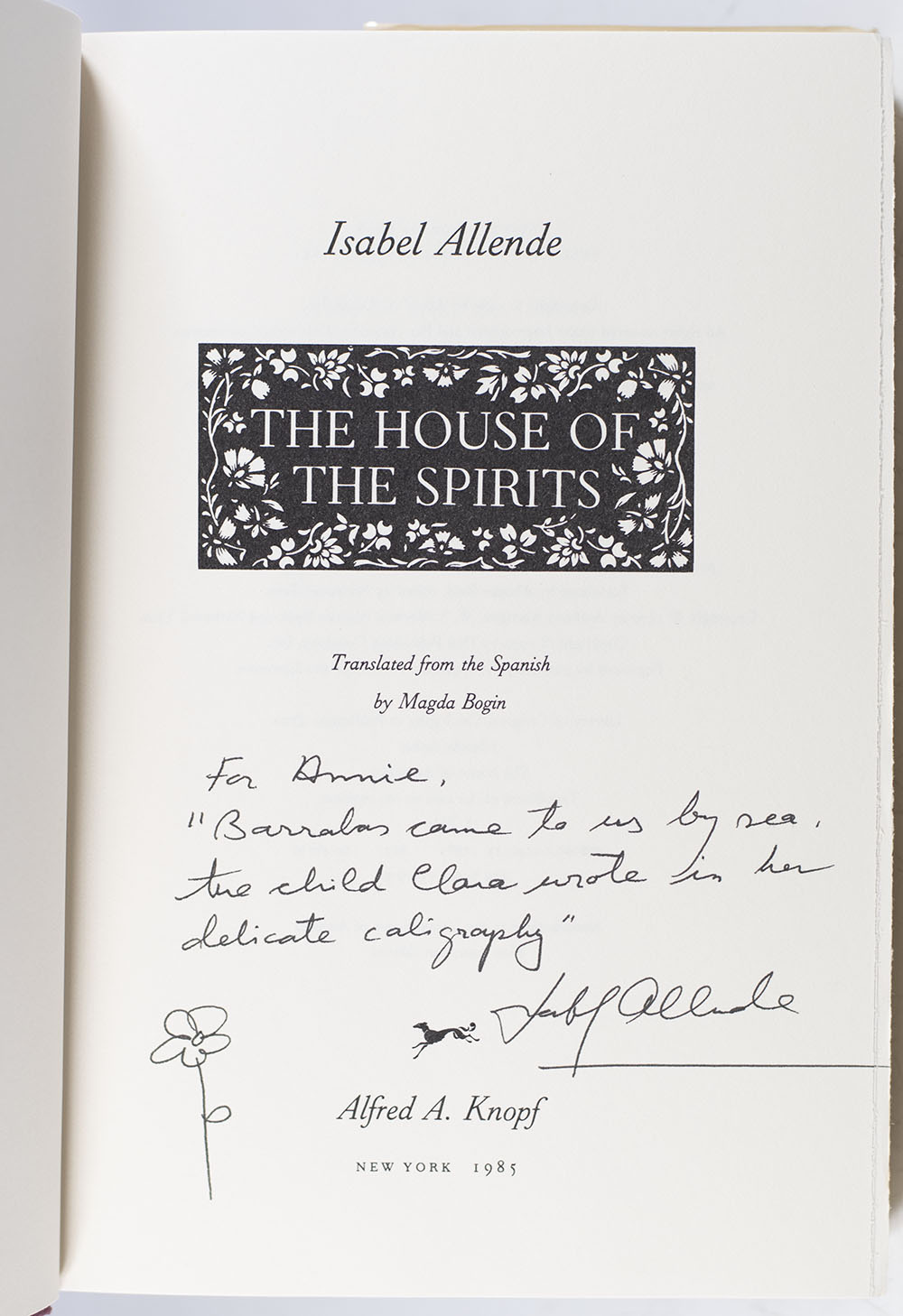 First edition of the author's first book. Octavo, original cloth. Translated from the Spanish by Magda Bogin. Association copy, inscribed by the author on the title page, "For Annie, 'Barrabas came to us by sea, the child Clara Wrote in her delicate calligraphy' Isabel Allende." Allende has also drawn a flower on the title page. The recipient, fellow author Annie Dillard has published works of poetry, essays, prose, and literary criticism, as well as two novels and one memoir. Her 1974 work Pilgrim at Tinker Creek won the 1975 Pulitzer Prize for General Nonfiction and her books have been translated into at least ten languages. Near fine in a near fine dust jacket. Jacket illustration by Michel Guire Vaka. Jacket design by Sara Eisenman. From the library of Annie Dillard. An exceptional example linking these two great writers.