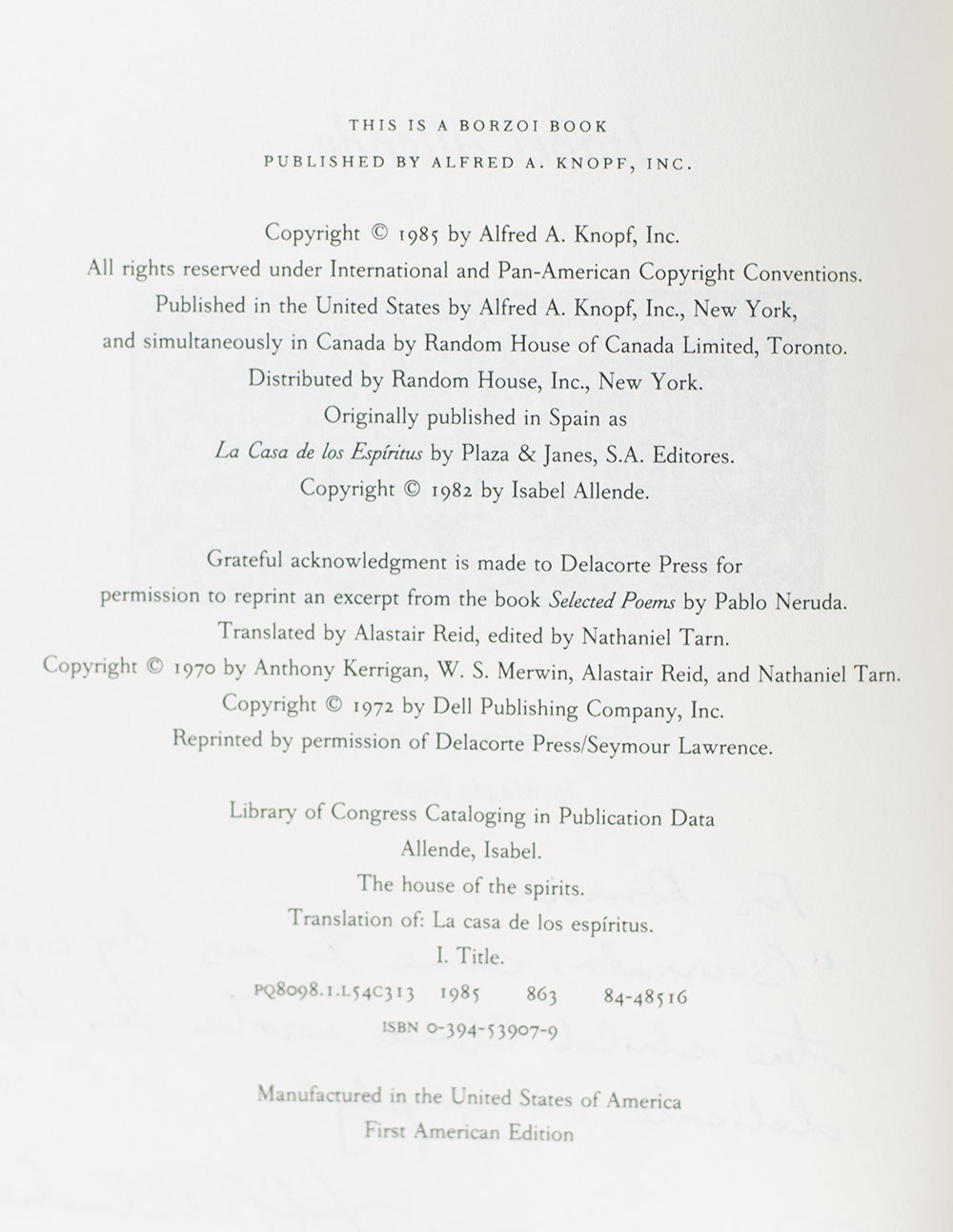 "Barrabas came to us by sea, the child Clara Wrote in her delicate calligraphy": First Edition of The House of Spirits; Lengthily Inscribed by Isabelle Allende to fellow novelist Annie Dillard
