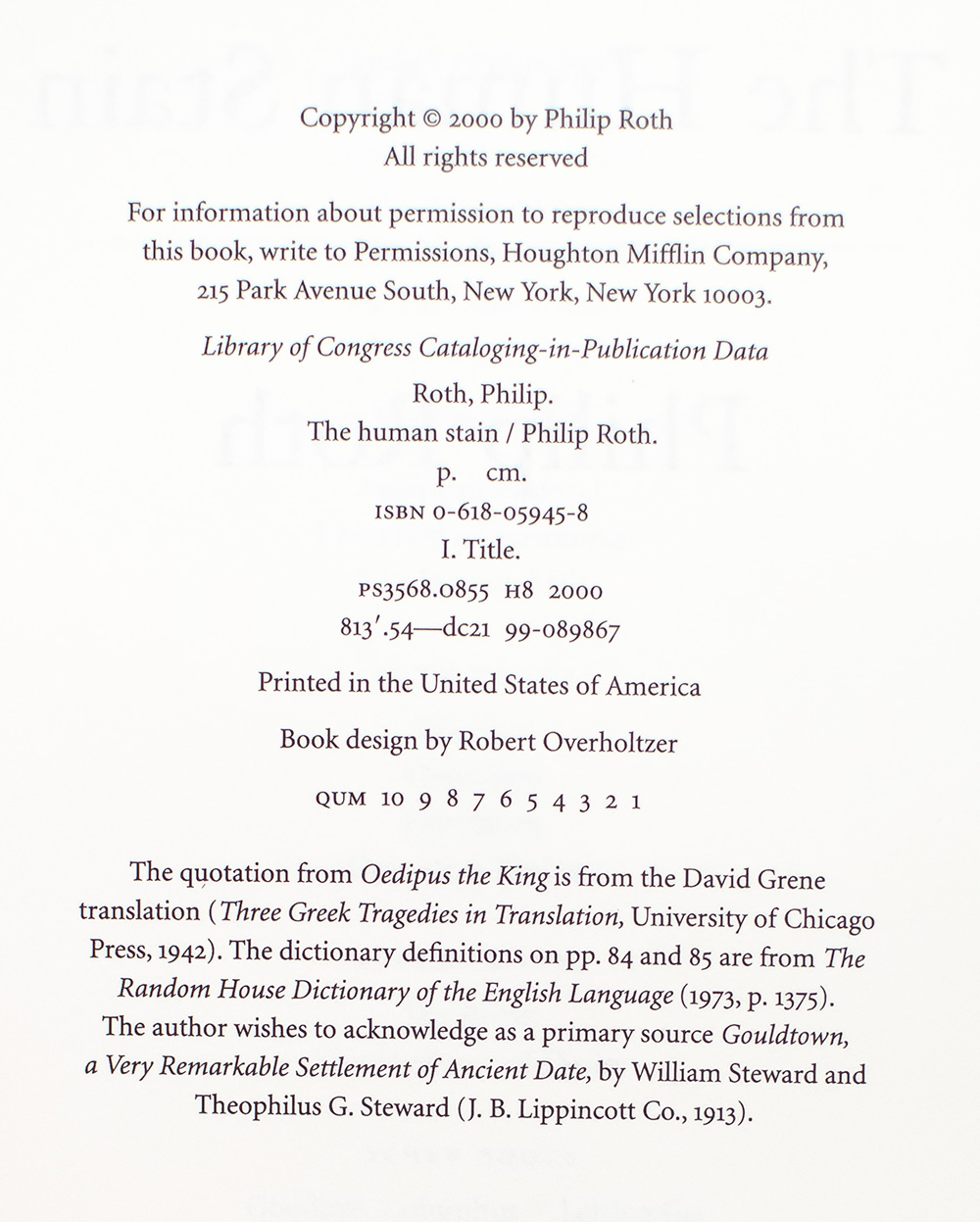 First edition, early printing of Roth's award-winning novel. Octavo, original half cloth. Fine in a near fine dust jacket. Jacket design by Michaela Sullivan.