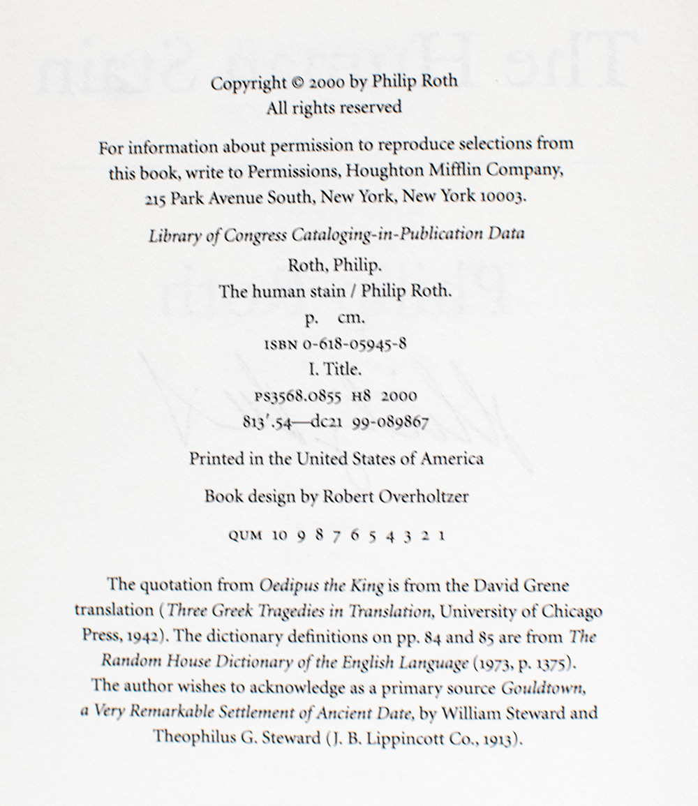 First edition of Roth's award-winning novel. Octavo, original half cloth. Boldly signed by Philip Roth on the title page. Near fine in a near fine dust jacket, inscription to the front free endpaper. Jacket design by Michaela Sullivan.
