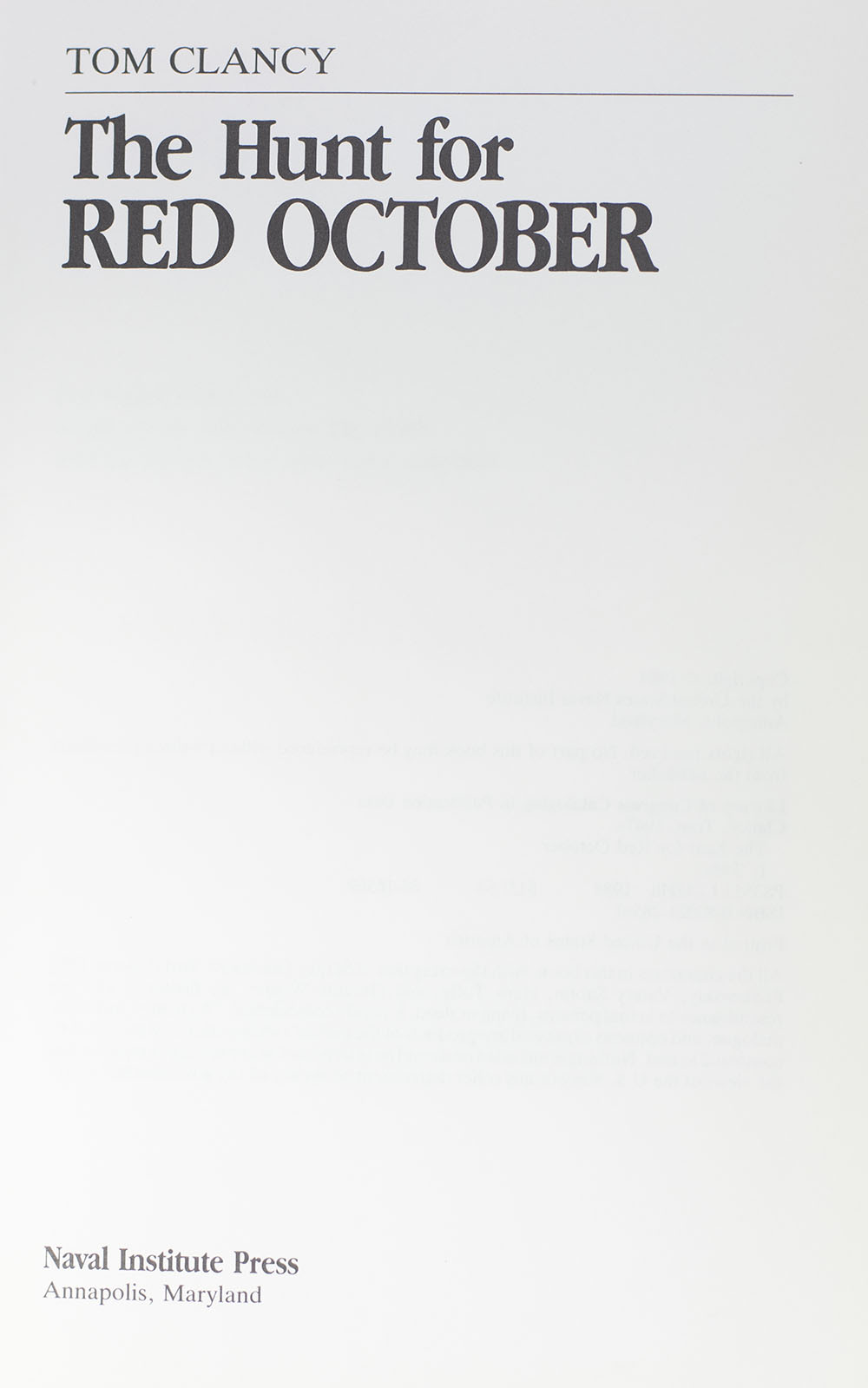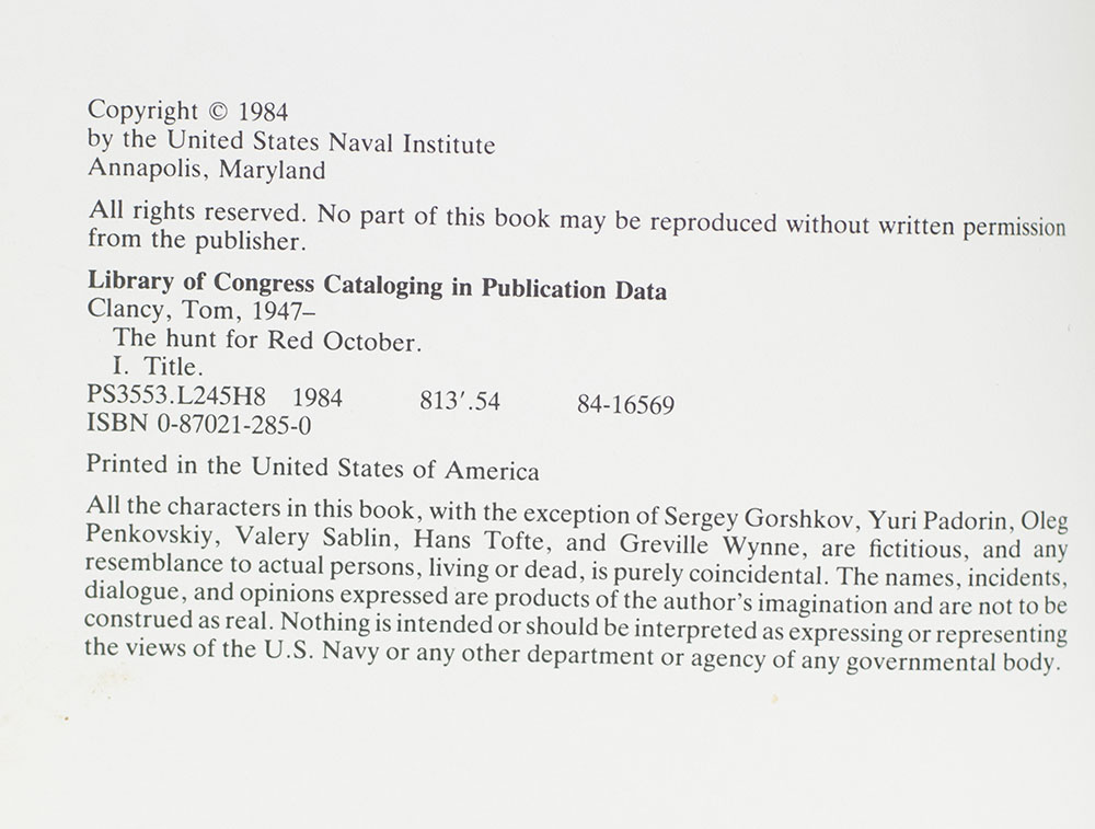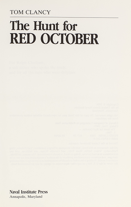 “Danger confronted properly is not something a man must fear": First Edition of Tom Clancy's The Hunt For Red October; Inscribed by Him