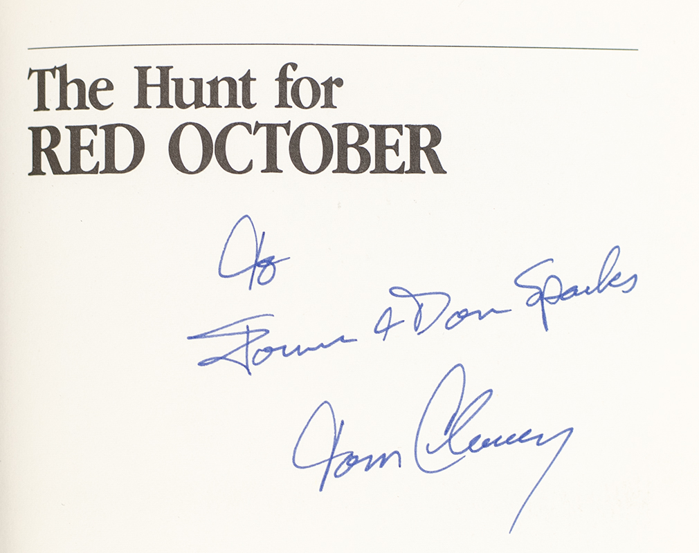 First edition of the author's classic first novel. Octavo, original red cloth. Presentation copy, inscribed by the author on the half-title page, "To Fan and Don Sparks Tom Clancy." Fine in a very good dust jacket.