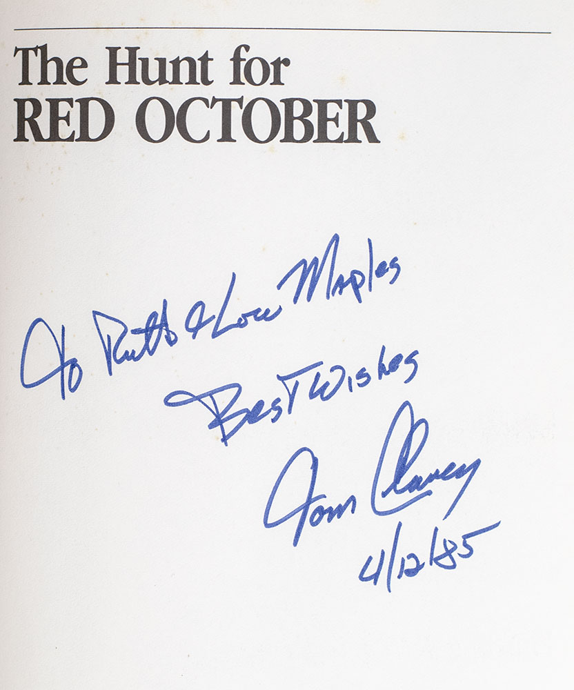 First edition of the author's classic first novel. Octavo, original red cloth. Presentation copy, inscribed by the author on the half-title page, "To Ruth and Lou Maples Best Wishes Tom Clancy 4/12/85." Near fine in a near fine price-clipped dust jacket.