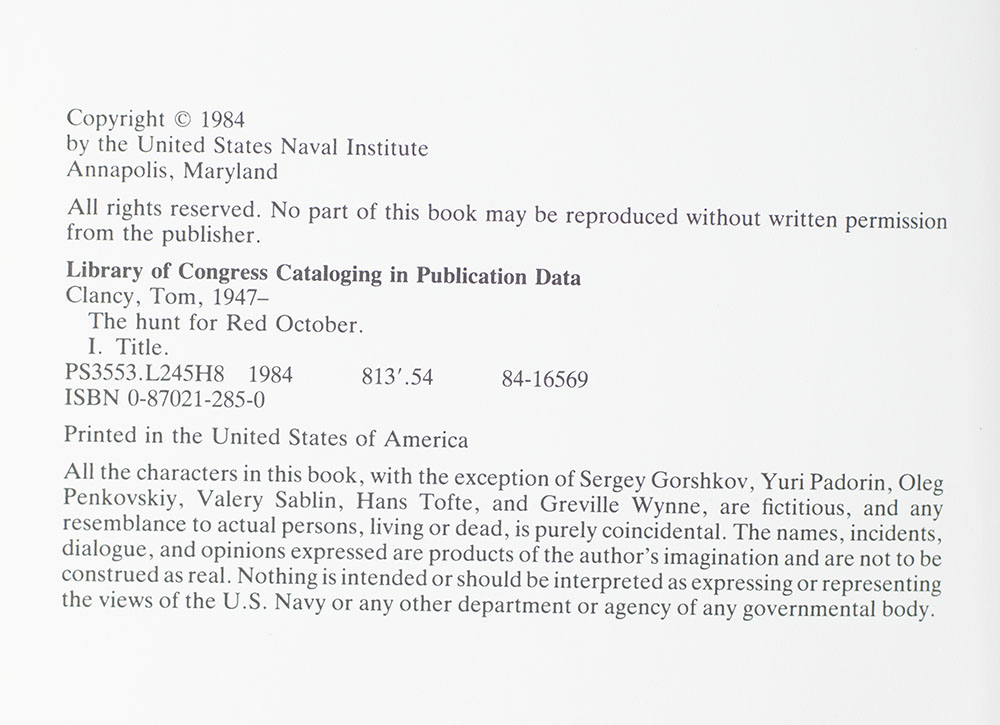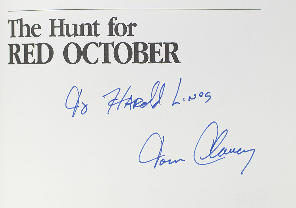 “Danger confronted properly is not something a man must fear": First Edition of Tom Clancy's The Hunt For Red October; Inscribed by Him