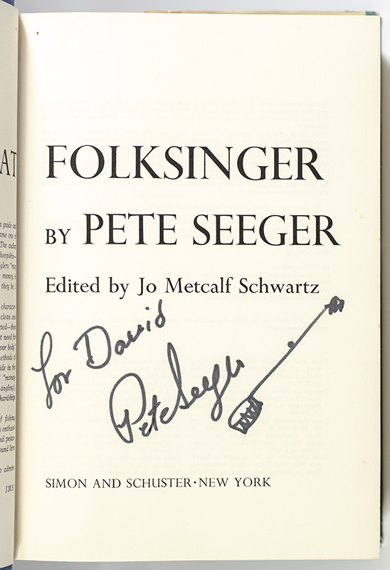 First edition of this work by the legendary folksinger. Octavo, original cloth, illustrated. Presentation copy, inscribed by the author on the title page, "For David Pete Seeger." Seeger has also drawn a picture of a banjo. Edited by Jo Metclaf Schwartz. Fine in a very good dust jacket. Jacket design by Wendell Minor.