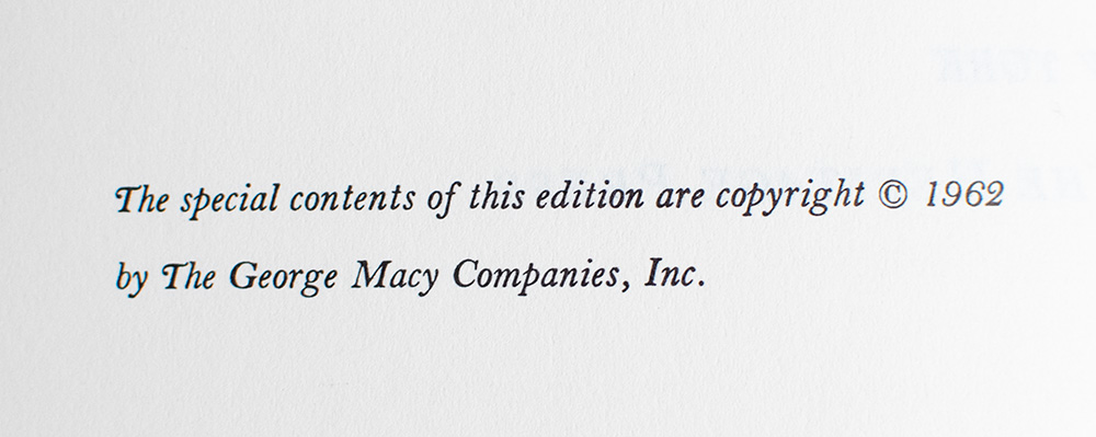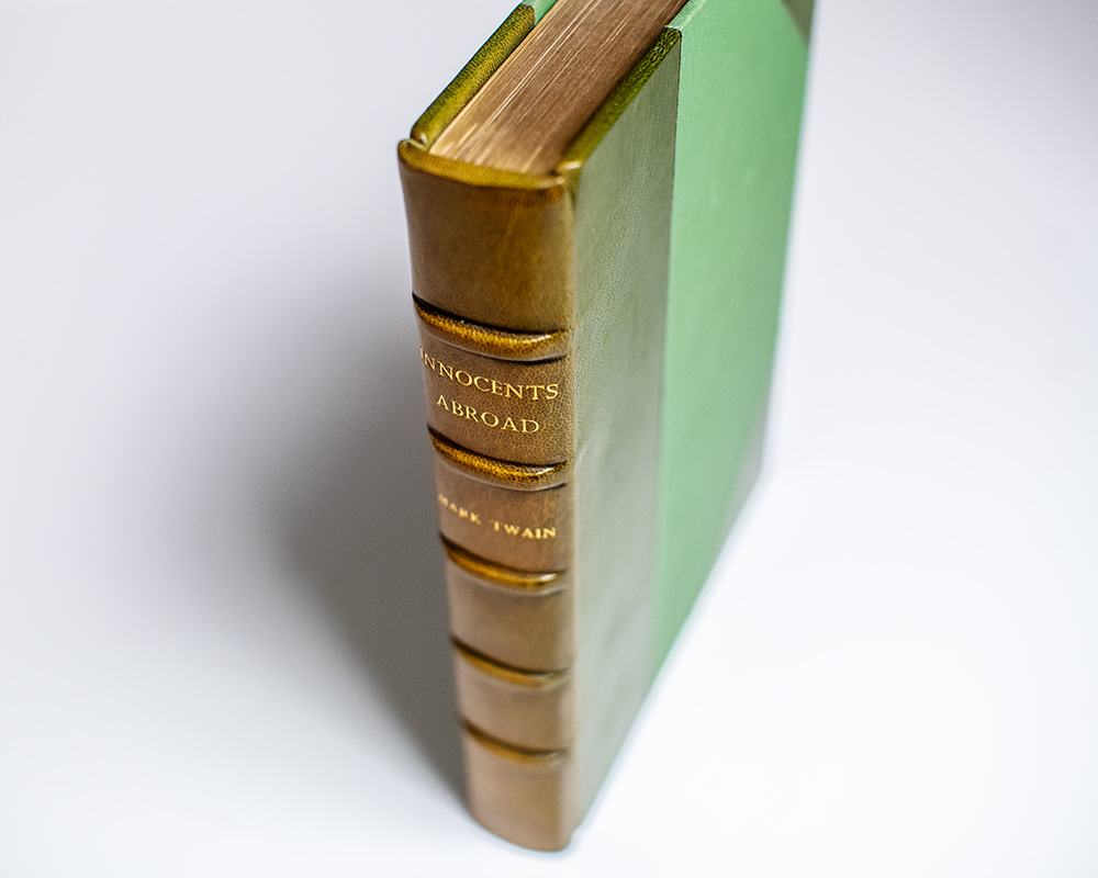 The Heritage Press edition of the author’s second book, one of the best-selling travel books of all-time. Octavo, bound in three-quarters morocco by Morrell with gilt titles to the spine in six compartments within raised bands, top edge gilt, marbled endpapers, title page vignette, with color illustrations throughout. In near fine condition with sunning to the spine. Introduction by Edward Wagenknecht. Illustrations by famous illustrator Fritz Kredel. Fritz Kredel was a distinguished German-American illustrator and graphic artist whose work played a significant role in the visual culture of 20th-century book design. Trained at the Kunstgewerbeschule in Frankfurt under Rudolf Koch, Kredel became known for his detailed woodcuts and illustrations, contributing to over 400 books, including notable collaborations with the Limited Editions Club and American publishers such as Random House and Heritage Press.
