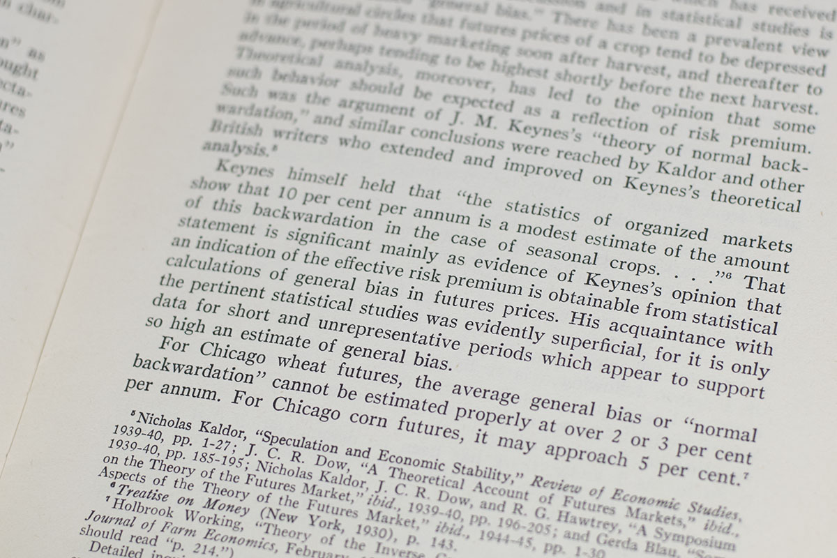 American professor of economics and statistics Holbrook Working was best known for his theories on hedging, future prices, market maker behavior, and the theory of storage (including the Working curve which plots the difference between short term and long term grain futures prices against current inventory). Working disagreed with Keynes's backwardation theory of futures prices, which argued that short hedgers (farmers) drive down futures prices because of their demand for price insurance. He, instead, argued that there could be hedgers on both sides of the market and that hedging was essentially not a risk reduction technique, but "speculation in the basis" which allows informed traders and commodity dealers to profit from their knowledge of future changes in the difference between futures and spot prices.