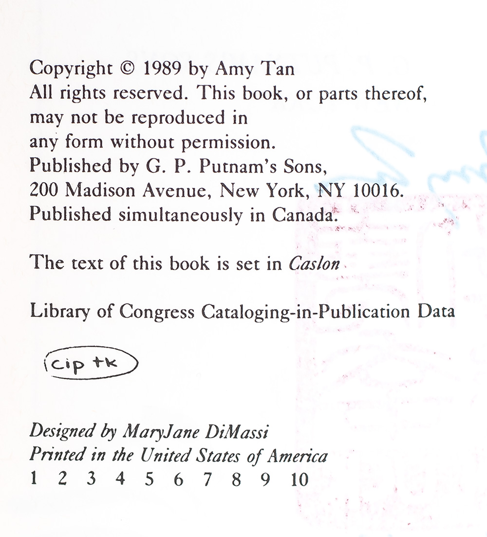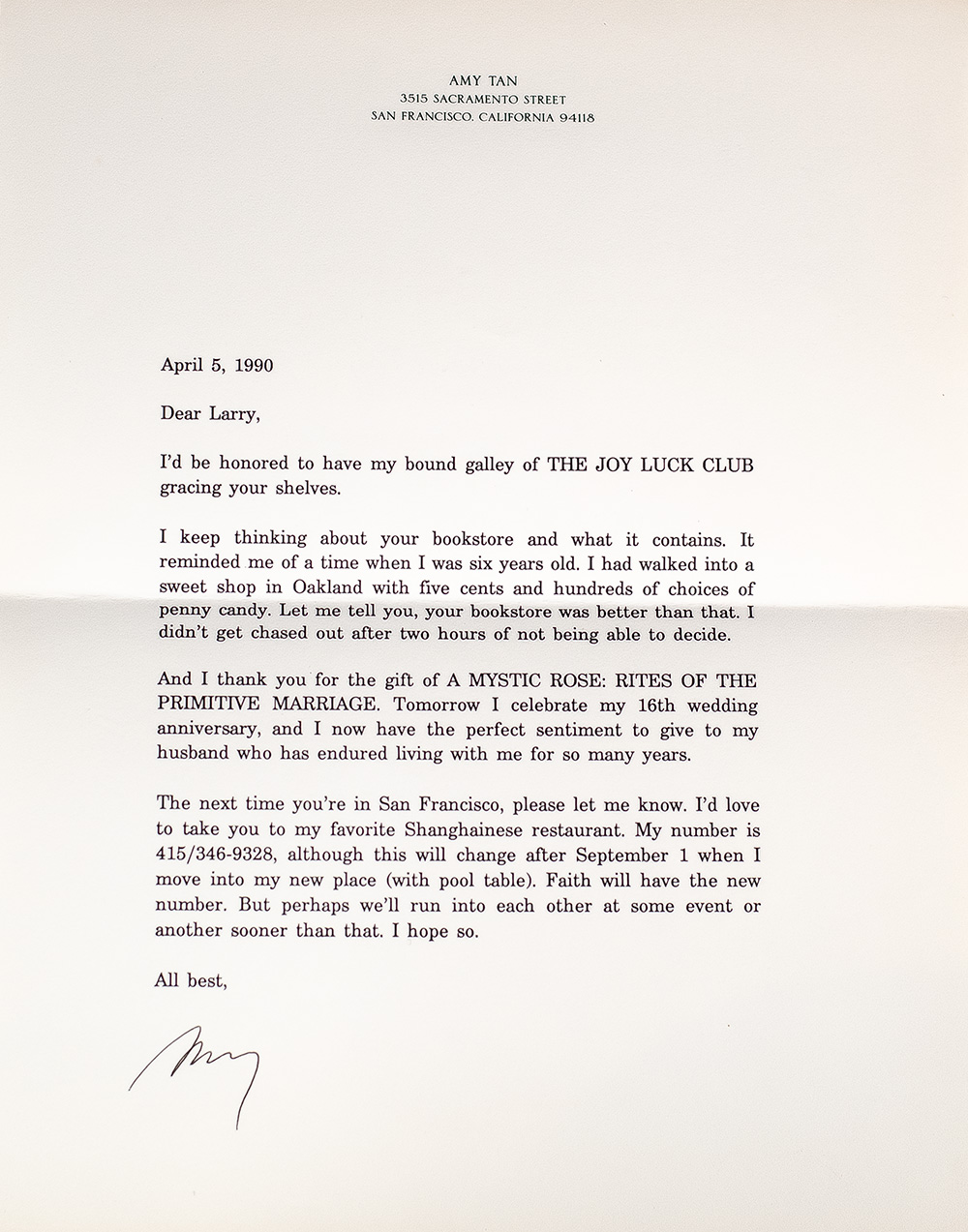 First edition, advance reading copy of Tan's masterpiece. Association copy, inscribed by the author on the title page, "For Larry McMurtry with thanks for the pleasure of your company and your good book. Amy 5 Apr '90." The recipient, Larry McMurtry remains best known for his 1985 Pulitzer Prize-winning novel Lonesome Dove which was adapted into a television miniseries that earned 18 Emmy Award nominations. McMurtry was also a prominent book collector and bookseller. In 1970 with two partners, he opened a book store in Georgetown, which he named Booked Up and 1988 he opened another Booked Up in Archer City which became one of the largest antiquarian bookstores in the United States, carrying between 400,000 and 450,000 titles. With the original typed transmittal letter signed by Amy Tan on her letterhead which reads in part: April 5, 1990 Dear Larry, I’d be honored to have my bound galley of THE JOY LUCK CLUB gracing your shelves. I keep thinking about your bookstore and what it contains. It reminded me of a time when I was six years old. I had walked into a sweet shop in Oakland with five cents and hundreds of choices of penny candy. Let me tell you, your bookstore was better than that. I didn’t get chased out after two hours of not being able to decide. And I thank you for the gift of A MYSTIC ROSE: RITES OF THE PRIMITIVE MARRIAGE. Tomorrow I celebrate my 16th wedding anniversary, and now I have the perfect sentiment to give to my husband who has endured living with me for so many years... All best, "Amy." Provenance: From the library of Larry McMurtry with his bookplate which he designed featuring the horseshoe-shaped brand his father and grandfather used on the McMurtry cattle. In very good condition.