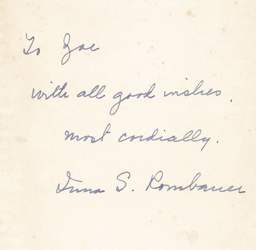 Early printing of Irma S. Rombauer's culinary classic. Octavo, original cloth. Presentation copy, inscribed by the author on the front free endpaper, "To Joe with all good wishes most cordially Irma S. Rombauer." In very good condition.