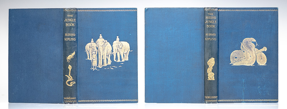 First editions of both volumes of The Jungle Book. Octavo, two volumes, original blue cloth decorated and lettered in gilt, all edges gilt, engraved frontispiece with tissue guard present. Illustrated by J. L. Kipling, W.H. Drake and P. Frenzeny. In near fine condition. Housed in a custom slipcase. A sharp example.