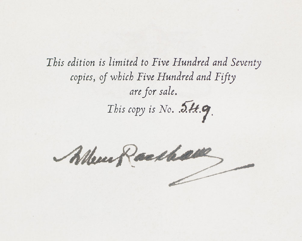Signed limited edition. Octavo, original limp vellum, gilt titles and decoration to front cover, illustrated endpapers, top edge gilt, color frontispiece and three plates, illustrations in the text, all by Rackham. Signed by Arthur Rackham, one of 570 copies of which 550 were for sale, this is number 549. Near fine in the the rare original slipcase, bookplate.