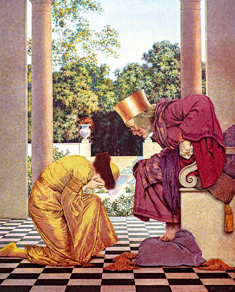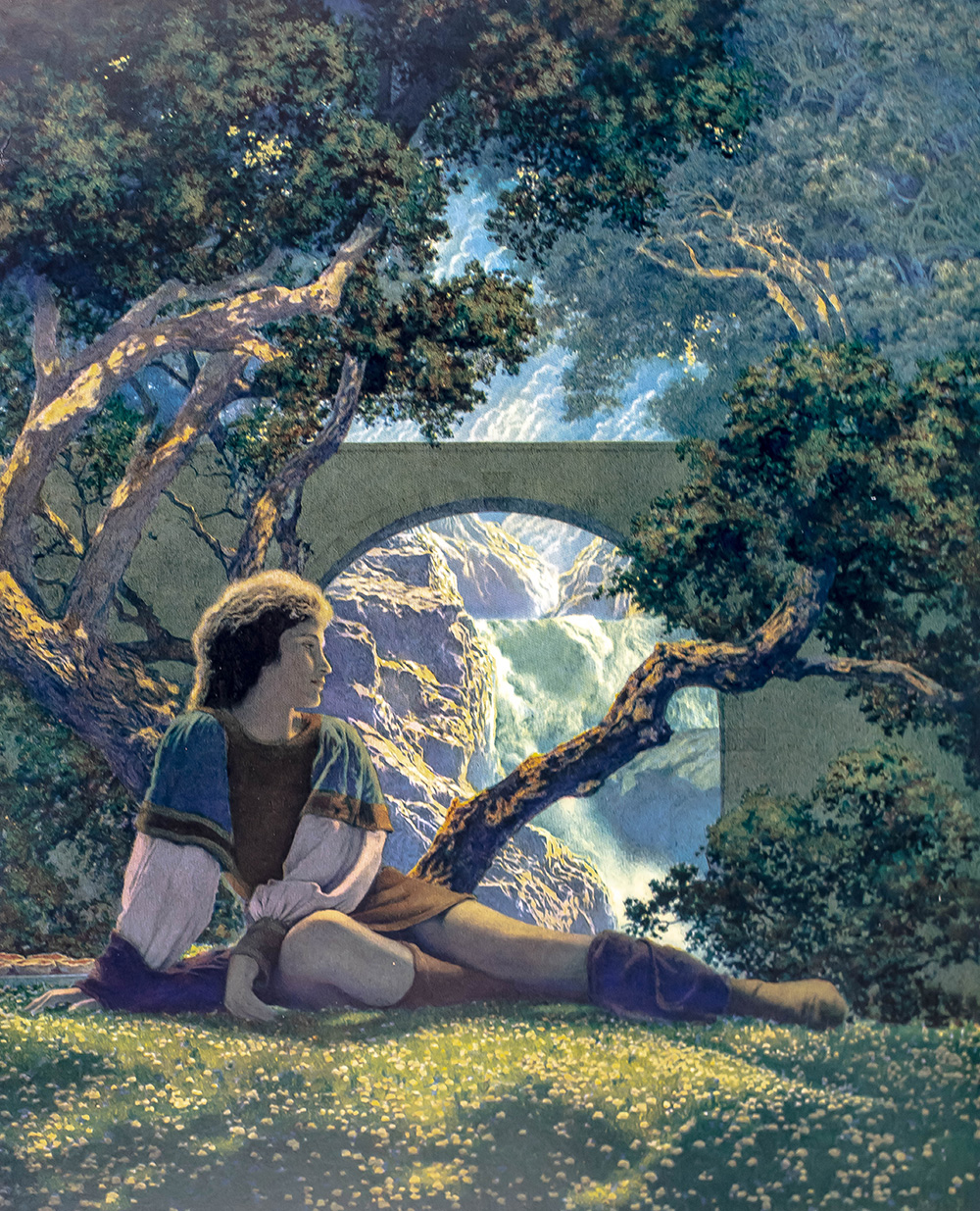 By 1900, Maxfield Parrish had become "recognized as one of America's most successful artists, achieving national popularity for his distinctively elegant style, detailed backgrounds and glowing colors" (Dalby, 42). He agreed to illustrate his friend Saunders' play "on account of the bully opportunity it gives for a very good time making the pictures. Imagination could run riot, bound down by no period, just good fun and all sorts of things" (Yount, 86-88). Silvey, 507.