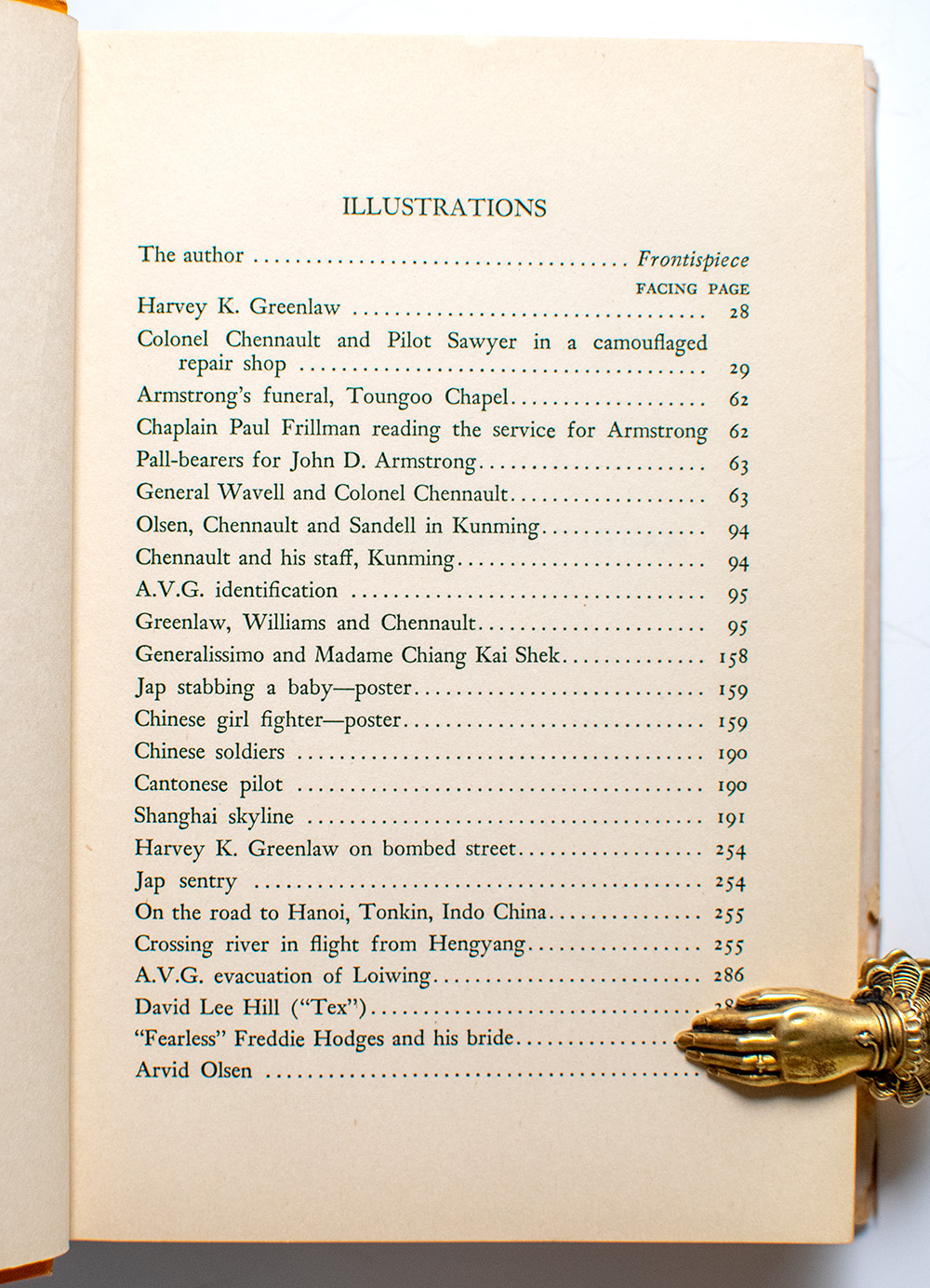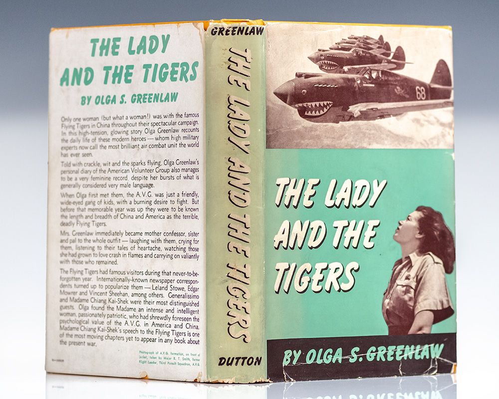 First edition, early printing of this memoir from the official war diarist for the "Flying Tigers". Octavo, original publisher's orange cloth, cartographic endpapers, frontispiece of the author, illustrated with black and white photographs. Presentation copy, warmly inscribed by the author on the verso of the front free endpaper, "To Mrs. Philippe Coombes, who has contributed so much towards the winning of this war, with best wishes, Olga S. Greenlaw." Fine in a good dust jacket. Jacket photograph taken by Major R.T. Smith, former flight leader, third pursuit squadron, A.V.G.