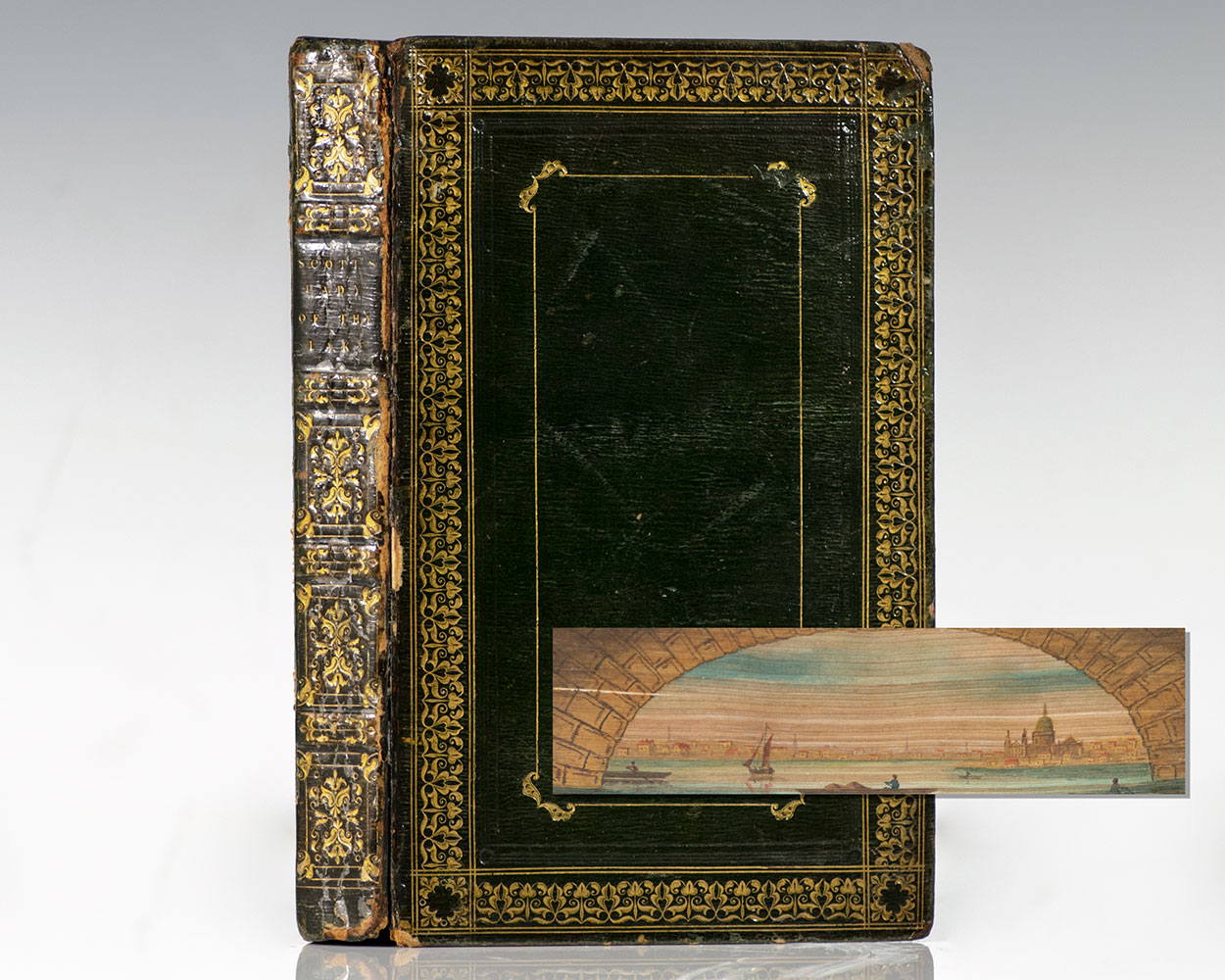The term 'fore-edge painting' can refer to any painted decoration on the fore-edges of the leaves of a book, such as was not uncommon in the 15th and early 16th centuries, particularly in Italy. The term is most commonly used, however, for an English technique quite widely practiced in the second half of the 17th century in London and Edinburgh, and popularized in the 18th century by John Brindley and, in particular, Edwards of Halifax, whereby the fore-edge of the book, very slightly fanned out and then held fast, is decorated with painted views, or conversation pieces. The edges are then squared up and gilded in the ordinary way, so that the painting remains concealed while the book is closed: fan out the edges and it reappears. The technique was practiced by a few other English binders in the late 18th and 19th centuries, and a certain number of undoubted examples survive. The majority of extant examples of fore-edge paintings date to the late 19th and early 20th century on reproductions of books originally published in the early 19th century, including the present volume.