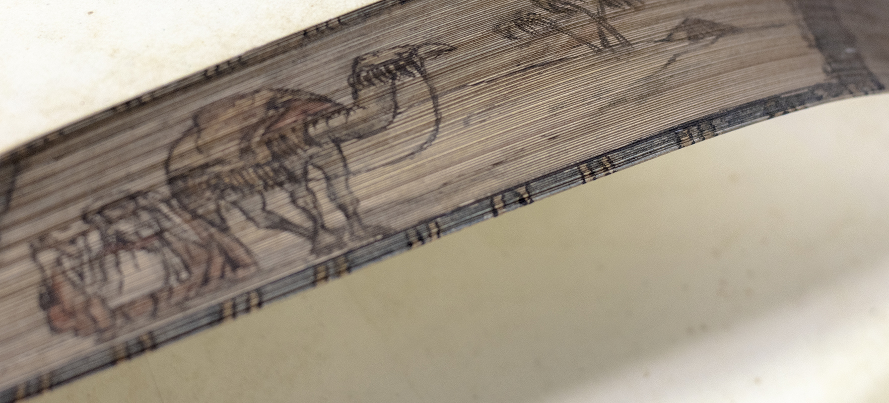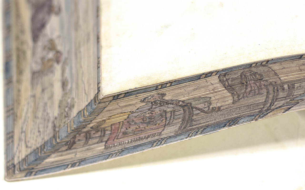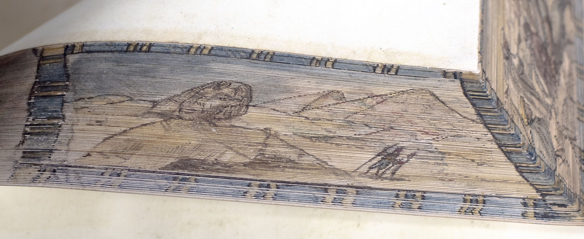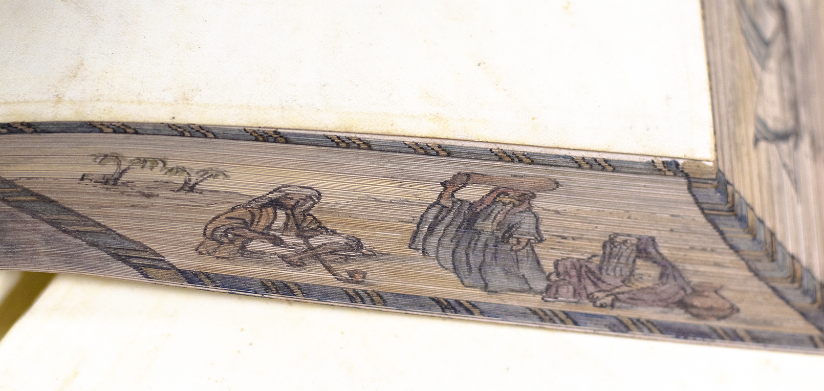 The first known example of a disappearing fore-edge painting (where the painting is not visible when the book is closed) dates back to 1649. In the mid 18th century, the subject matter of fore-edge paintings evolved from simply decorative or heraldic designs to landscapes, portraits and religious scenes, usually painted in full color. The technique was popularized by John Brindley (1732-1756), publisher and bookbinder to the Prince of Wales and Edwards of Halifax, a distinguished family of bookbinders and booksellers. The majority of extant examples of fore-edge paintings date to the late 19th and early 20th century on reproductions of books originally published in the early 19th century, including the present volume.