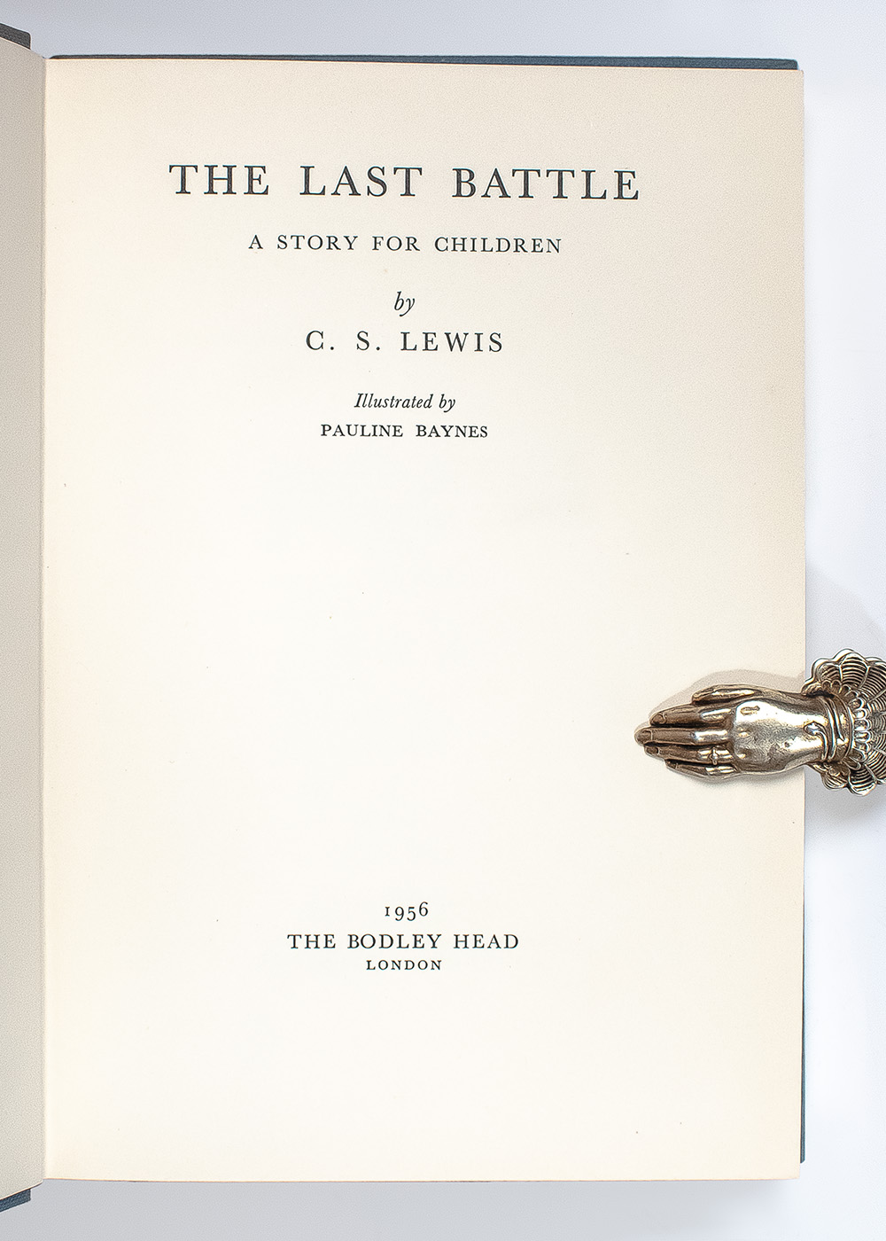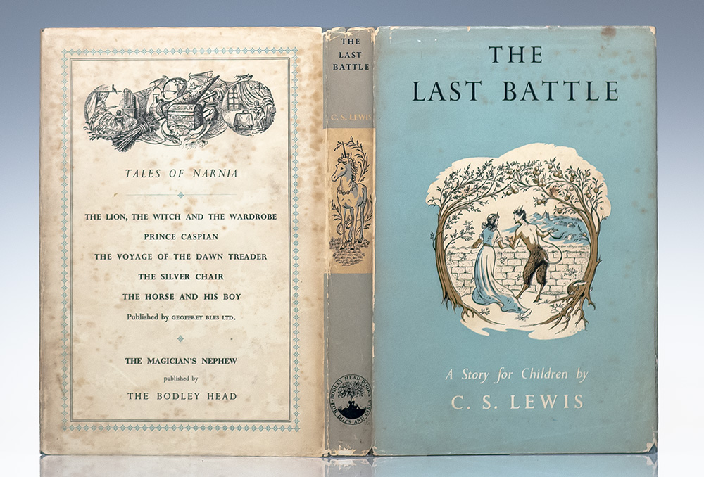 First edition of the last novel in Lewis' classic Narnia series. Octavo, original cloth, illustrated. Near fine in a near fine dust jacket, contemporary inscription to the front free endpaper. Illustrated by Pauline Baynes. A nice example.