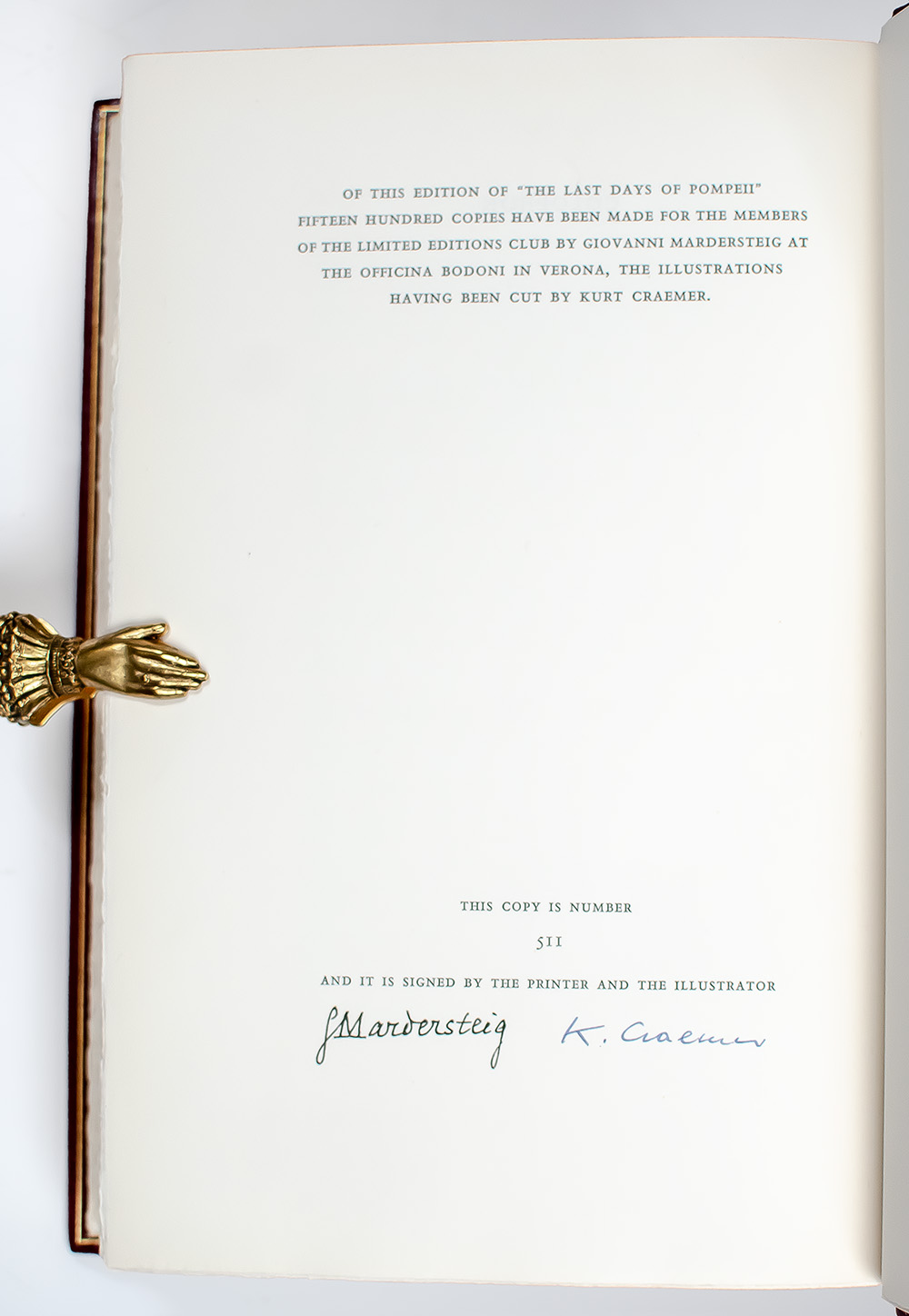 The Limited Editions Club signed limited edition of Bulwer-Lytton's most celebrated work, a classic of historical fiction and the basis for the 1935 Hollywood film of the same name directed by Ernest B. Schoedsack and Merian C. Cooper. Quarto, bound in full crushed levant morocco by Sangorski & Sutcliffe with gilt titles and ruling to the spine in six compartments within raised gilt bands, gilt ruling to the front and rear panel, gilt-ruled turn-ins and inner dentelles stamp-signed by Sangorski & Sutcliffe, marbled endpapers, top edge gilt with others untrimmed, illustrated by Kurt Craemer. One of fifteen hundred numbered copies signed by the printer and the illustrator on the colophon, this is number 511. In fine condition.