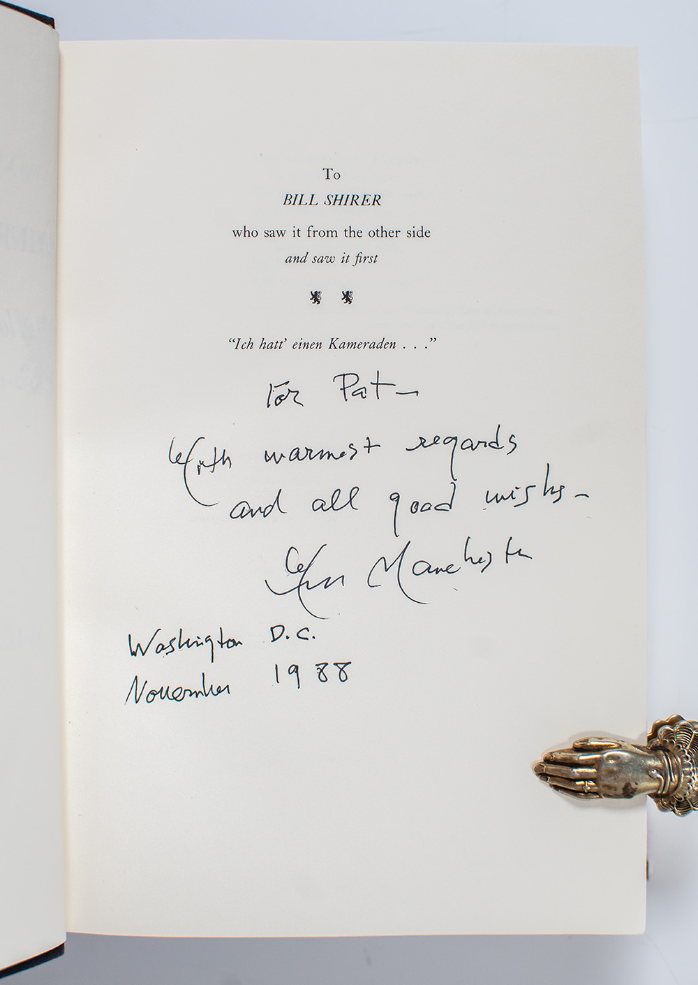 First editions of the author’s acclaimed trilogy on Winston Churchill. Octavo, original cloth, illustrated. Each volume is signed or inscribed by the author: Vol. I is signed by William Manchester on the title page; Vol. II is lengthily inscribed by William Manchester in the year of publication on the dedication page, “For Pat- With warmest regards and all good wishes- Wm Manchester Washington D.C. November 1988”; Vol. III is inscribed by Paul Reid, whom Manchester chose to finish the volume following his death in 2004, "To Christopher Stercins with Best wishes to a great Churchillian Paul Reid Nov 2 2013." Each volume is near fine to fine in a near fine to fine dust jacket with light wear. A very nice set, uncommon signed.
