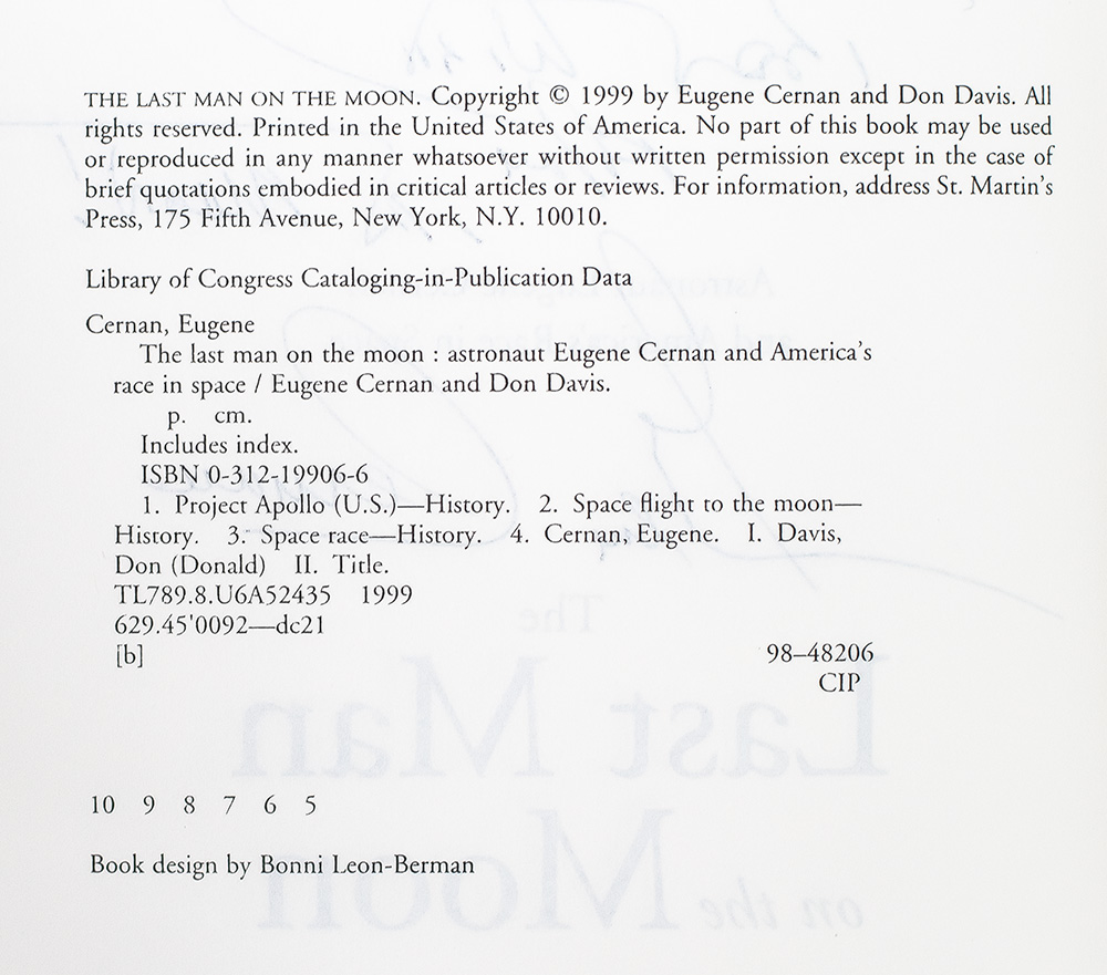 First edition, early printing of this revealing and dramatic look at the inside of the American space program from one of its pioneers. Octavo, original cloth, illustrated with photographs. Presentation copy, inscribed by the author on the title page, "To Bob - Best wishes from the Moon! Gene Cernan." Fine in a near fine dust jacket. Jacket design by Michael Storrings.