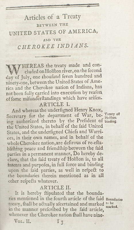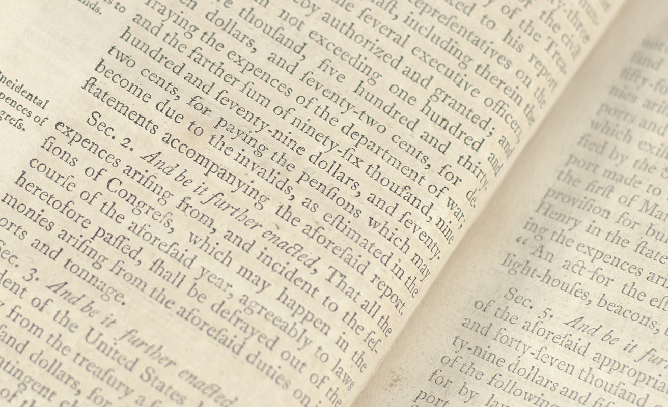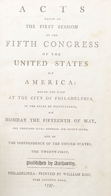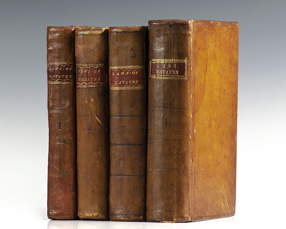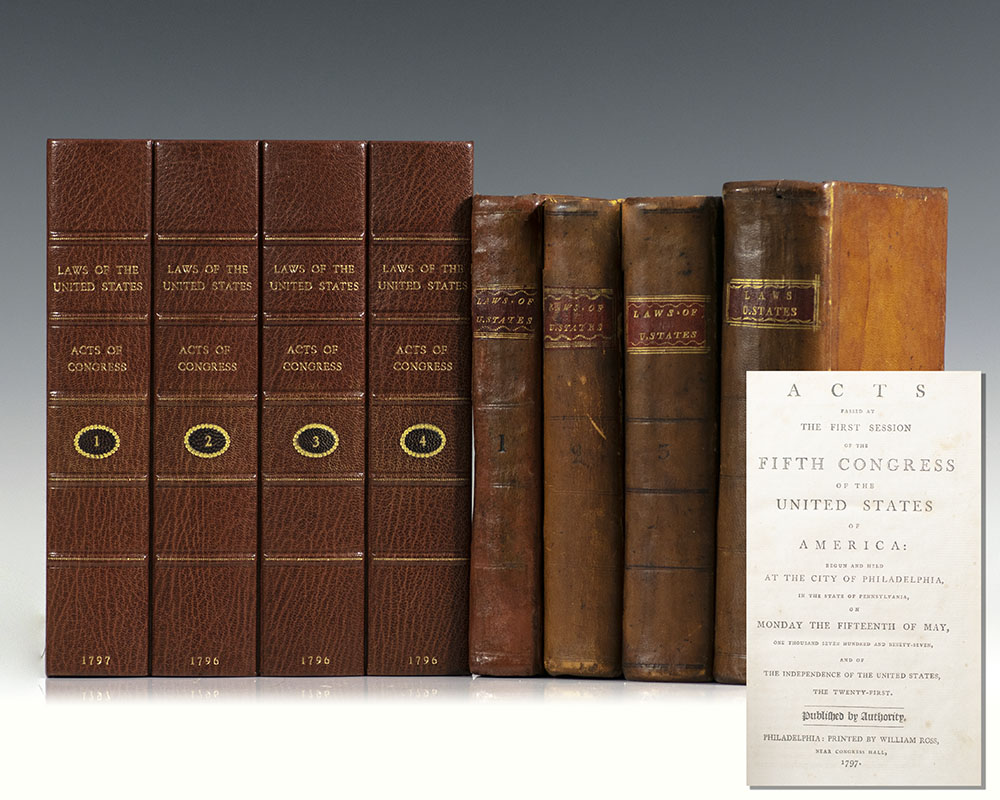 First editions of the scarce Folwell and Ross printings of the Laws of the United States as passed by the first five Congresses. Octavo, four volumes bound in full contemporary sheep with red morocco spine labels lettered in gilt, blind ruling to the spine and front panel. Printed in three volumes, the scarce first Richard Folwell editions contain the texts of the Constitution, the Bill of Rights, and the Treaty of Paris, and all the Congressional acts passed by the first through fourth Congresses with an extensive index in the third volume containing in itself a complete Digest of all the Laws of the United States. Complete with the addition of a fourth volume (also indexed), being the combined Ross and Folwell printing of the laws of the Fifth Congress, containing important early official printings of the Alien and Sedition Acts. Signed into law by President John Adams in 1798, the Alien and Sedition Acts included the Naturalization Act, signed into law on June 18, 1798, which increased the residency requirement for American citizenship from five to fourteen years and created other hurdles to citizenship the Alien Friends Act, passed on June 25, which allowed the President to imprison or deport aliens considered 'dangerous to the peace and safety of the United States'; and the Alien Enemies Act, passed on July 6, which authorized the President to imprison or deport any male, whether an alien or American citizen, related to an enemy nation in times of war. Far more important to domestic politics of the era was the Sedition Act, passed on July 14, 1798, which made it a crime if 'any person shall write, print, utter, or publish, or shall cause or procure to be written, printed, uttered, or published any false, scandalous and malicious writing or writings against the government of the United States, or either house of Congress of the United States, or the President of the United States.to bring them, or either of them, into contempt or disrepute.' A number of individuals were prosecuted under the Sedition Act, notably Representative Matthew Lyon, political writer James Callender, and several Republican newspaper editors including Benjamin Franklin Bache. The acts were denounced by Democratic-Republicans and ultimately helped them to victory in the 1800 election, when Thomas Jefferson defeated the incumbent, President Adams. The Sedition Act and the Alien Friends Act were allowed to expire in 1800 and 1801, respectively. The Alien Enemies Act, however, remains in effect as Chapter 3; Sections 21–24 of Title 50 of the United States Code and was used by the government to identify and imprison allegedly "dangerous enemy" aliens from Germany, Japan, and Italy in World War II. Also notable throughout this four-volume set are United States treaties establishing foreign and Native American relations, laws governing copyright, slavery, crime, duties, fisheries, banking, judicial powers, the office of the President, the establishment of the Treasury and War departments, the Post Office, and the census. In near fine condition. Ownership inscriptions. Housed in a custom half morocco clamshell box. Rare and desirable.