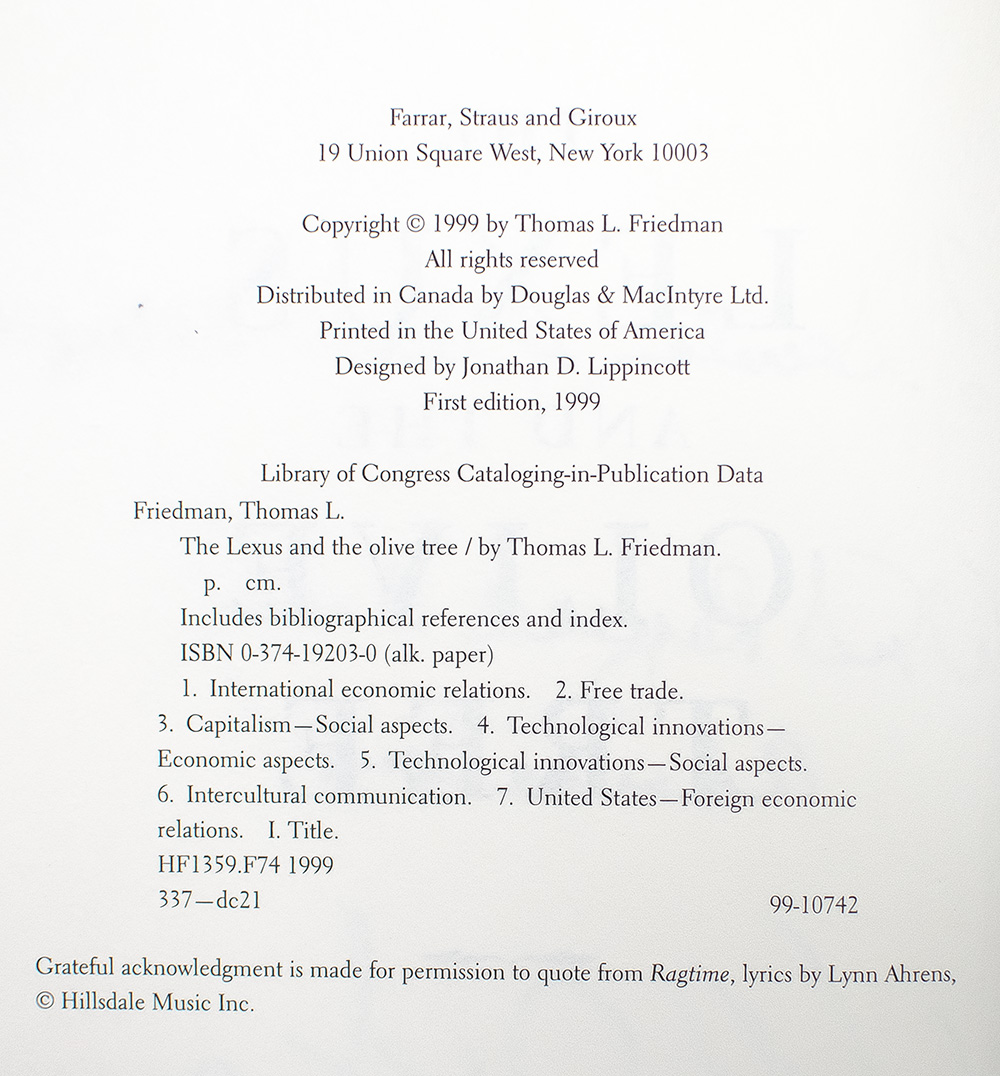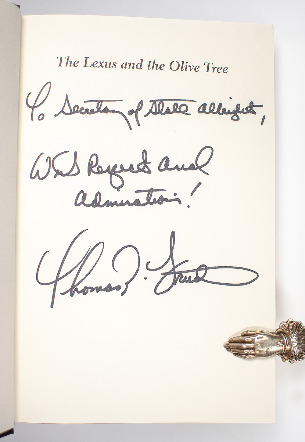 first edition of the lexus and the olive tree; inscribed by Thomas L. Friedman to Secretary Madeleine K. Albright