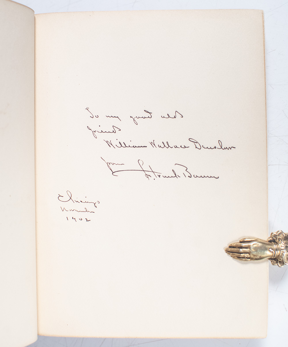 First edition of this Christmas classic, inscribed by Baum to the W.W. Denslow, who illustrated The Wonderful Wizard of Oz. Octavo, original publisher's bright red pictorial cloth decorated in in green, white and tan, pictorial endpapers, illustrated by Mary Cowles Clark with 20 plates, 6 in full color including frontispiece. Association copy, inscribed by the author on the second blank to illustrator W.W. Denslow, "To my good old friend William Wallace Denslow from L. Frank Baum Chicago November 1902." The recipient, William Wallace Denslow was an American illustrator and caricaturist best remembered for his work in collaboration with L. Frank Baum, most notably his illustrations of The Wonderful Wizard of Oz. His drawings did more than decorate the text; they established the book’s visual logic, fixing character types, settings, narrative mood in a style shaped by late-nineteenth-century poster art, Art Nouveau ornament, a confident command of line. Denslow’s status as a prominent editorial cartoonist, trained in satire, symbolism, political shorthand, has invited later scholarship to read the Oz images as forms of visual argument, not merely accompaniment, since the habits of caricature often carry social critique into popular fantasy. In this way his association with Baum becomes a study in co-authorship across media, with illustration serving as a parallel narrative voice that helped secure the work’s immediate appeal, then shaped its long cultural afterlife. In very good condition. A very nice example with exceptional provenance, we have never seen another signed inscribed example, let alone with such an association.