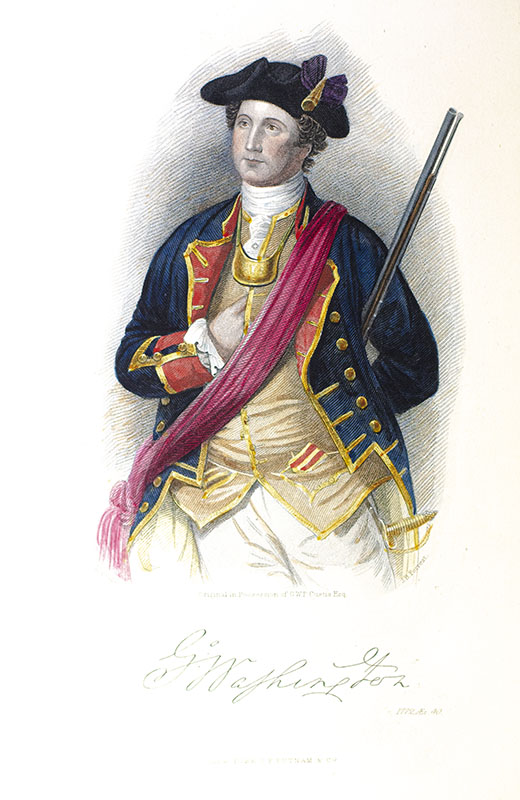 First edition of Irving's monumental biography of George Washington. Quarto, bound in half crushed red levant with gilt titles and tooling to the spine in six compartments within raised gilt bands, top edge gilt, marbled endpapers, illustrated with 47 hand-colored plates including tissue-guarded frontispiece to each volume. One of one hundred and ten numbered copies of the quarto edition, this is number forty-five. In near fine condition. An attractive example of this rare work.