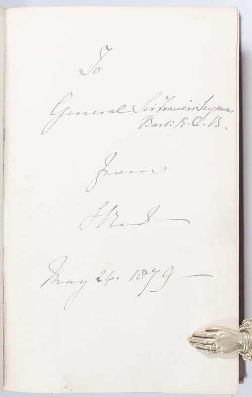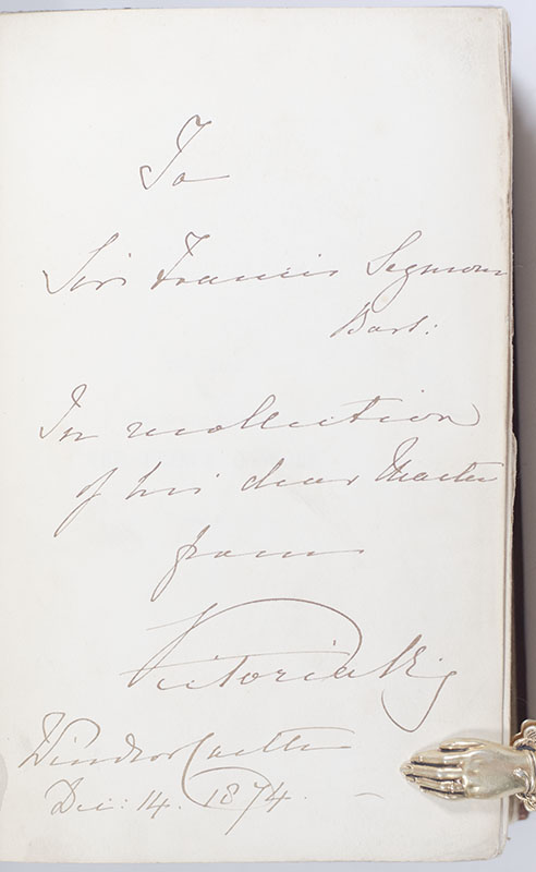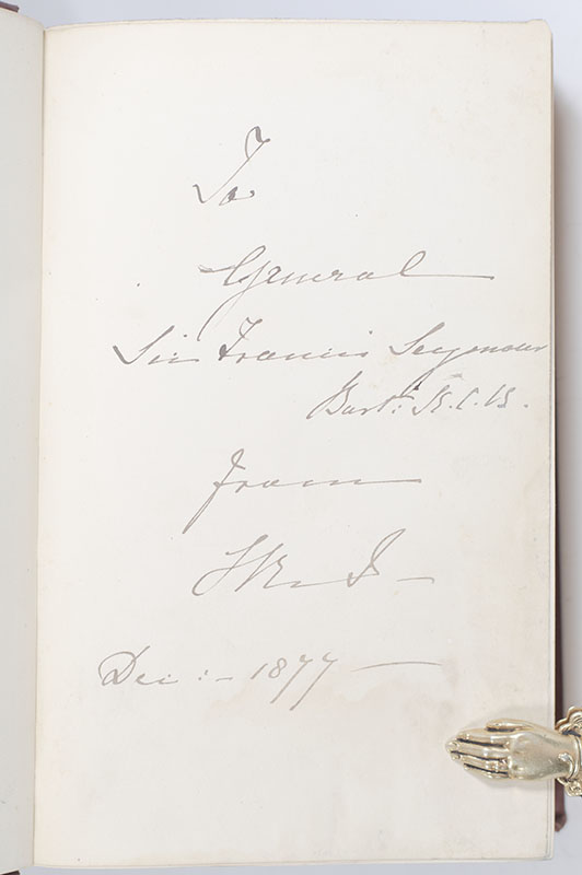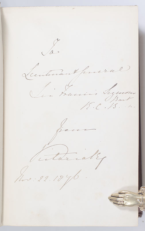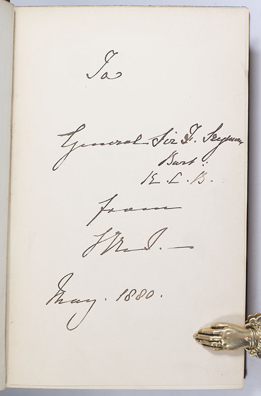 Complete set of Martin's extensive biography of Prince Albert, contracted and edited by Queen Victoria, each volume inscribed by her. Octavo, five volumes, original cloth with gilt titles to the spine, stamped ruling to the panels, tissue-guarded engraved frontispiece to each volume, illustrated with 8 additional tissue-guarded plates of portraits and views; one a folding facsimile of a draft memorandum by Prince Albert to Lord Lyons in 1861. Association copies, each volume is inscribed by Queen Victoria on the front free endpaper to Sir Francis Seymour. Volume I is inscribed, "To Sir Francis Seymour Bart. In recollection of his dear Mother from Victoria Windsor Castle Dec. 14, 1874." Volume II is inscribed, "To Lieutenant General Sir Francis Seymour Bart. from Victoria Nov. 22, 1876." Volume III is inscribed, "To General Sir Francis Seymour Bart. from Victoria R December 1877." Volumes IV and V are similarly inscribed. The recipient, Sir Francis Seymour, 1st Baronet, was a British Army officer and courtier. His son, Albert Victor Francis Seymour, who was born when Seymour was 74 years old served as a Page of Honour to Queen Victoria. In very good condition. Mixed editions as often: vols. I, IV, and V are first editions, vol. II is a second edition, and vol. III is a fifth edition. Rare and desirable with all five volumes inscribed.