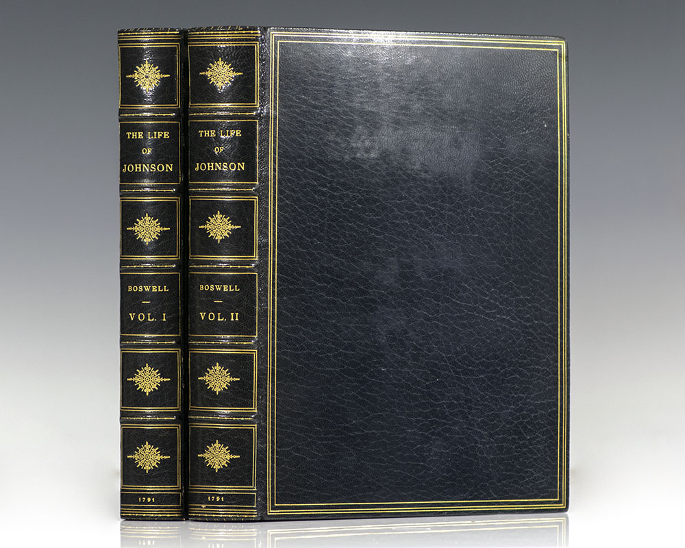 First edition, first issue of both volumes of the most celebrated biography in the English language, which was published on May 16, 1791 in a print run of only 1,750 copies. Quarto, bound in full morocco by Birdsall, gilt titles and tooling to the spine, raised bands, inner dentelles, all edges gilt. Frontispiece portrait of Samuel Johnson, engraved by J. Heath after the Sir Joshua Reynolds (1756) painting. Housed in a custom clamshell box. In fine condition. An excellent example of this landmark work.