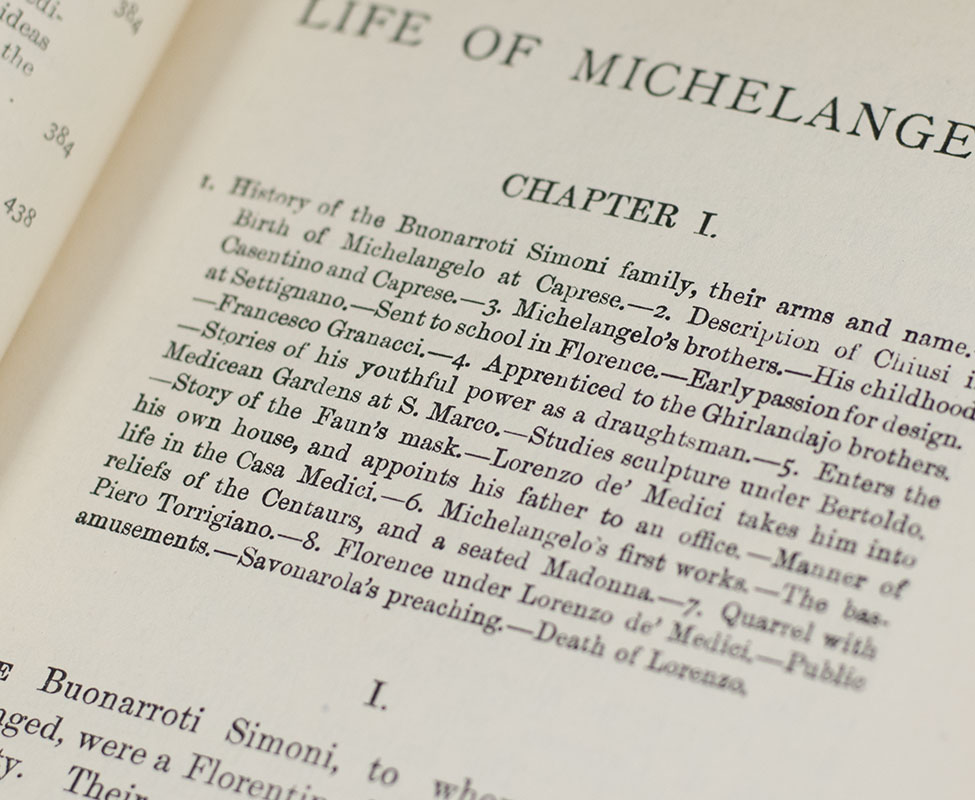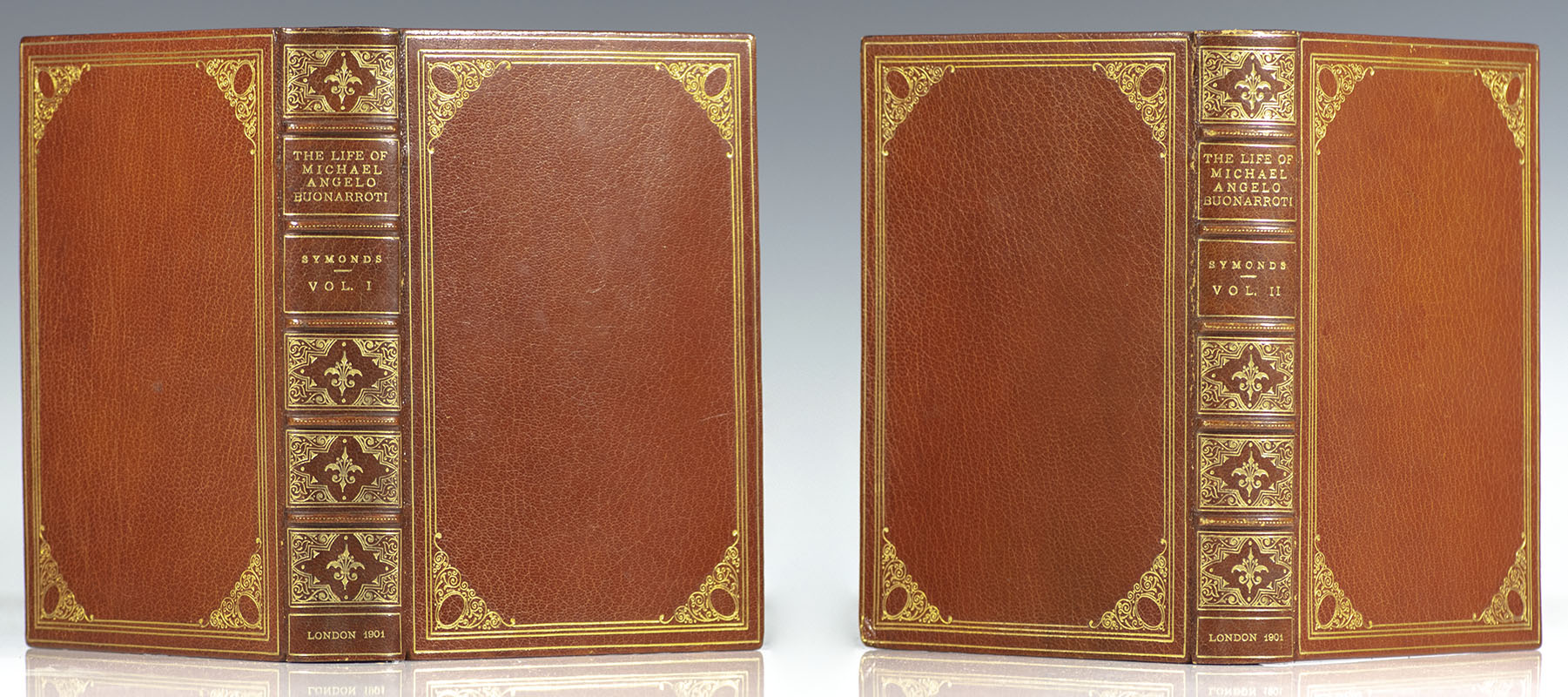 The illustrated biography of the famed Renaissance artist, elaborately bound in full morocco by Stikeman. Octavo, two volumes bound in full morocco by Stikeman with gilt titles and tooling to the spine in six compartments within raised gilt bands, quadruple gilt ruling to the panel with ornamental cornerpieces, gilt turn-ins and inner dentelles, marbled endpapers and gilt topstain, illustrated with a tissue-guarded frontispiece portrait of Michelangelo and 50 illustrations of his masterworks. In near fine condition. An exceptional example.
