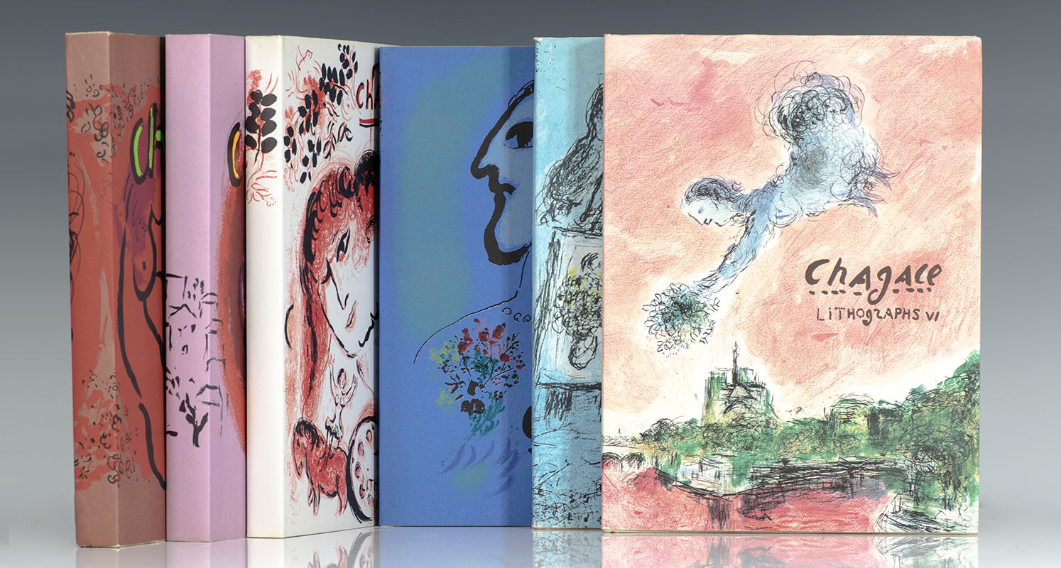 First editions of all six volumes in the catalogue raisonne of Chagall’s lithographs, richly illustrated with 28 original lithographs. Quarto, original cloth, original dust jackets each with original lithograph, original acetates. Introduction by Marc Chagall. Fine in fine dust jackets. Volumes 1-3 have the original cardboard boxes. Scarce complete set of all 6 volumes with all lithographs present.